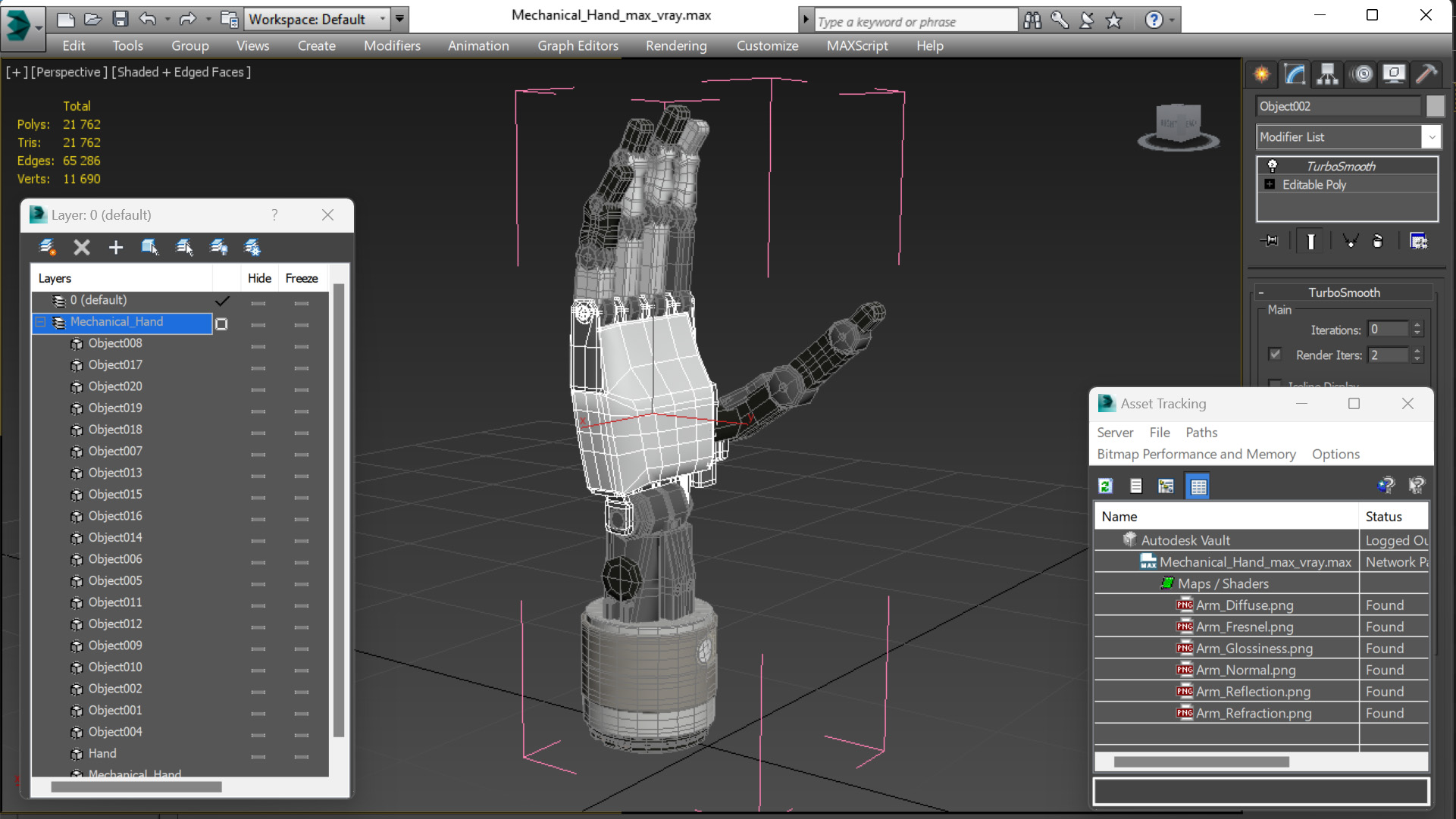 Mechanical Hand is a high quality, photo real 3d model that will enhance detail and realism to any of your rendering projects. The model has a fully textured, detailed design that allows for close-up renders, and was originally modeled in 3ds Max 2020 and rendered with V-Ray. Renders have no postprocessing!