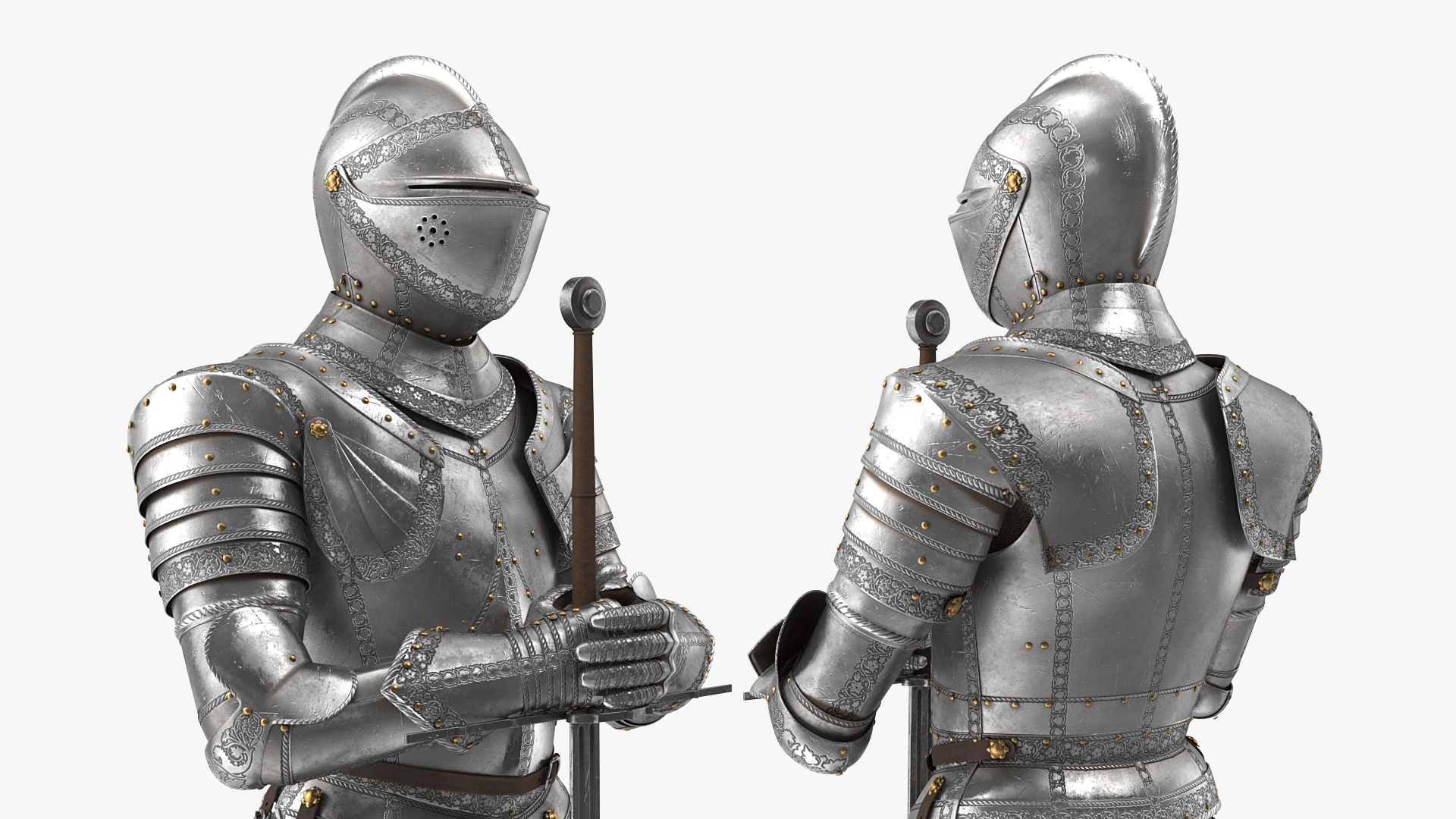 Medieval Knight Plate Armor standing with Zweihander is a high quality, photo real 3d model that will enhance detail and realism to any of your rendering projects. The model has a fully textured, detailed design that allows for close-up renders, and was originally modeled in 3ds Max 2020 and rendered with V-Ray. Renders have no postprocessing!