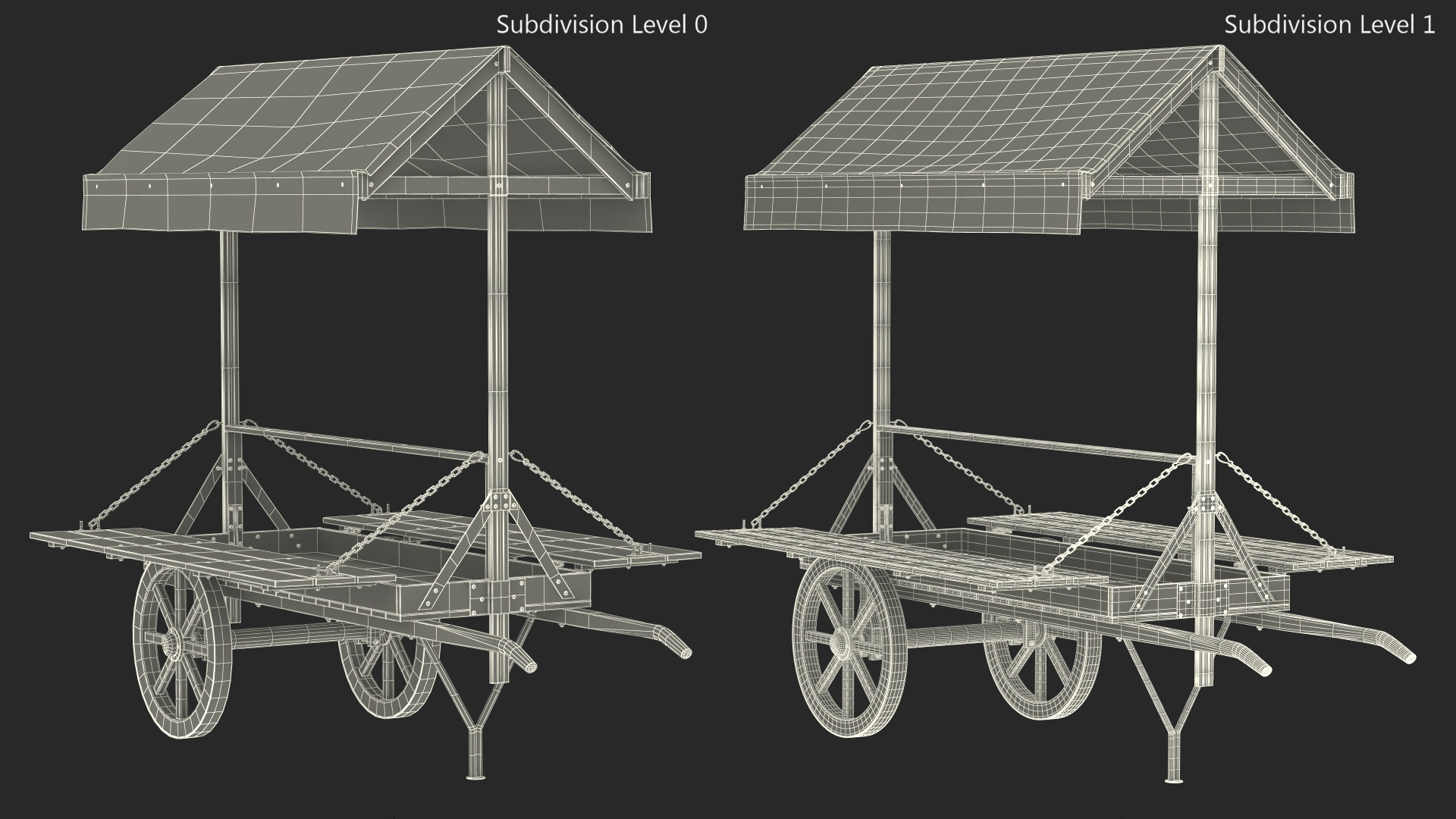 Medieval Market Cart with Awning is a three-dimensional model of ancient wooden market cart that is a Medieval style wheeled wooden vehicle, and that was used for outdoor retail business, and that is a small cart with a pair of wheels at the front and two supporting leg and two handles at the rear.