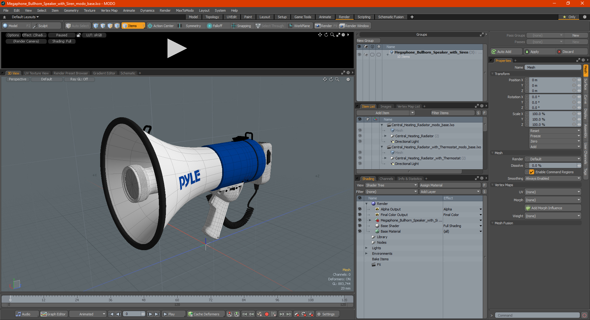 Megaphone Bullhorn Speaker with Siren is a high quality, photo real 3d model that will enhance detail and realism to any of your rendering projects. The model has a fully textured, detailed design that allows for close-up renders, and was originally modeled in 3ds Max 2020 and rendered with V-Ray. Renders have no postprocessing!