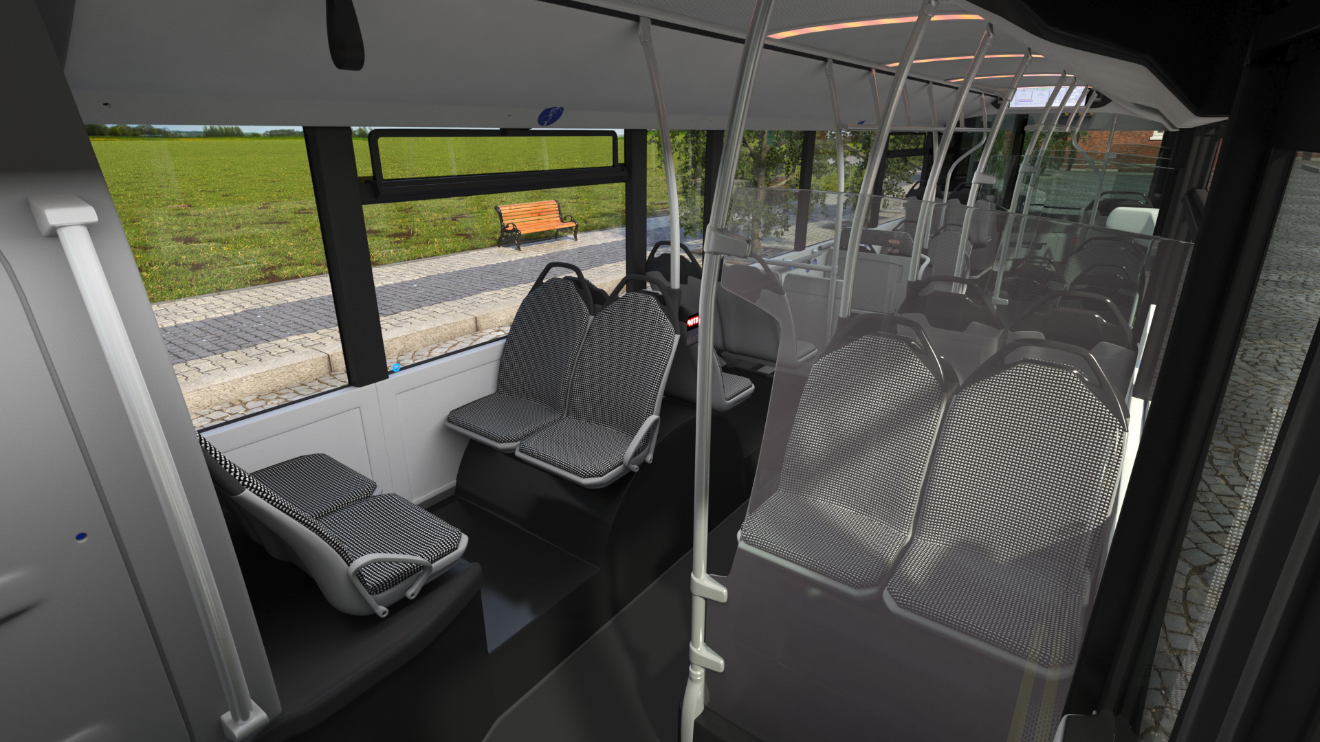 Mercedes-Benz eCitaro Three Doors Simple Interior is a three-dimensional model of a passenger Daimler electric city (urban) vehicle with all-electric drive, LED headlamps, special powerful electrical batteries, etc..