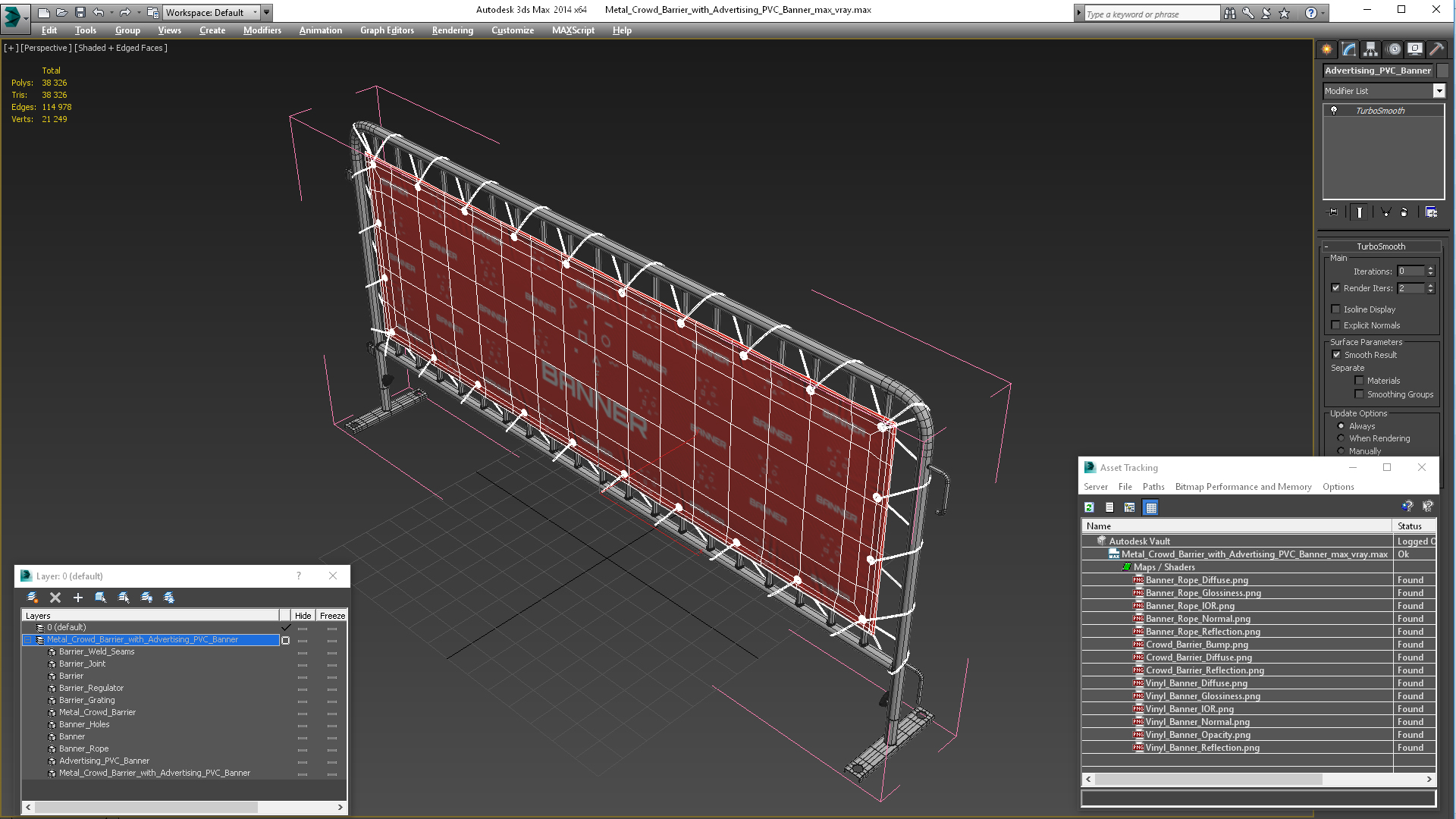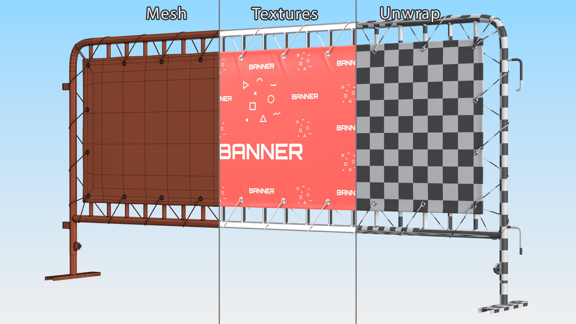 Metal Crowd Barrier with Advertising PVC Banner is a high quality, photo real 3d model that will enhance detail and realism to any of your rendering projects. The model has a fully textured, detailed design that allows for close-up renders, and was originally modeled in 3ds Max 2020 and rendered with V-Ray. Renders have no postprocessing!