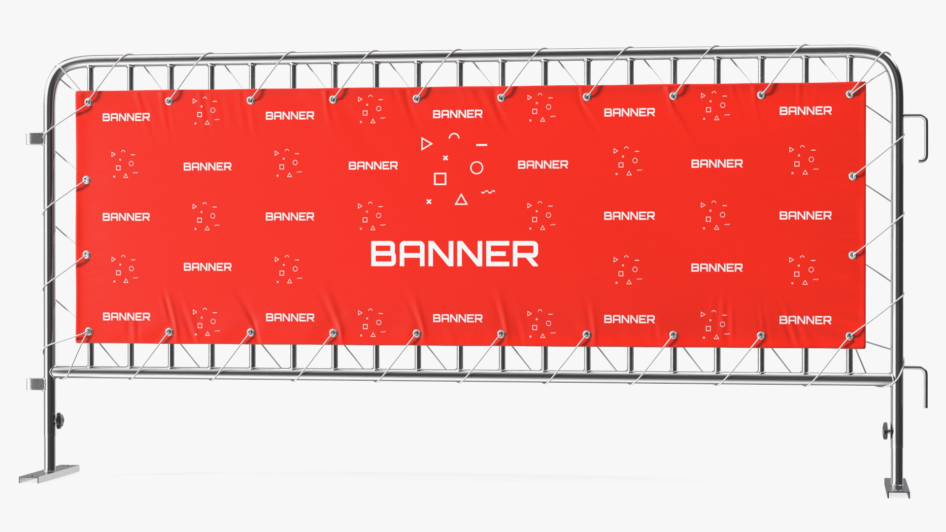 Metal Crowd Barrier with Advertising PVC Banner is a 3D model of mockup of street barrier which is a restricted zone equipment (forbidden public area tool) with fabric banner with advertising content.