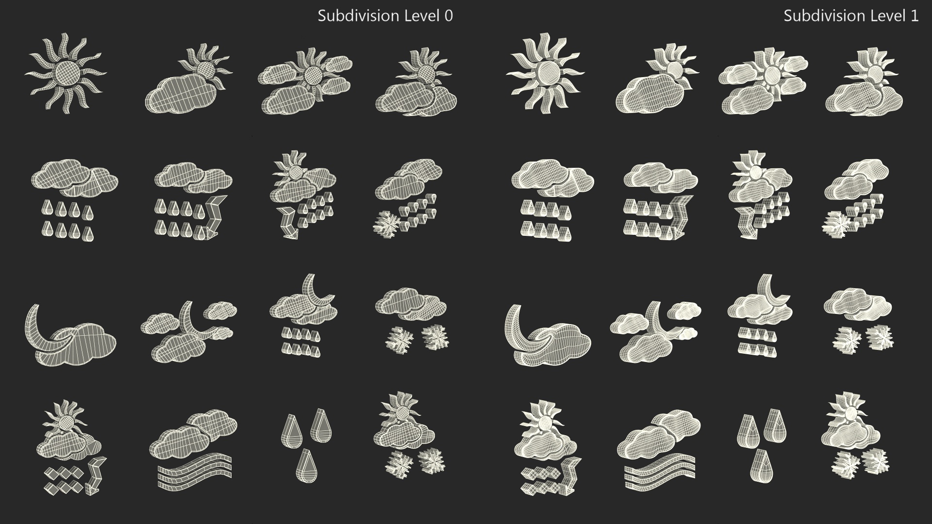 Meteorology Symbols Set is a 3D model of collection of icons which used to represent different weather conditions, such as rain, clouds, sun, wind and snow.