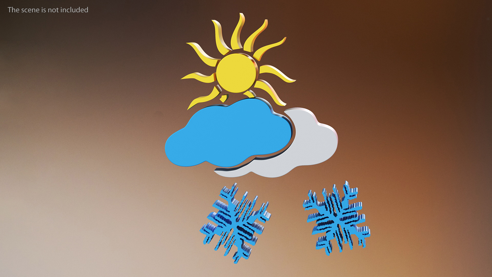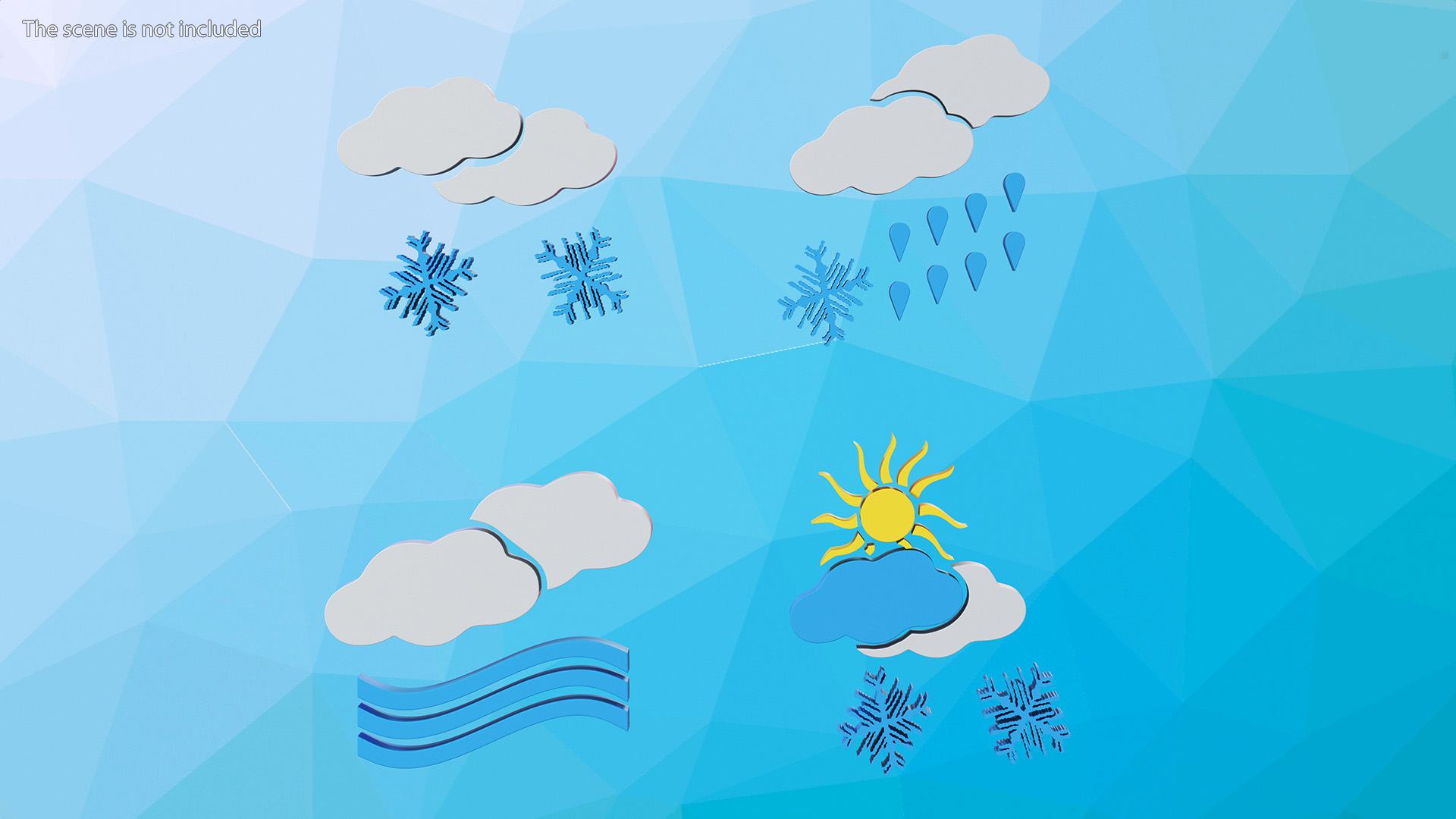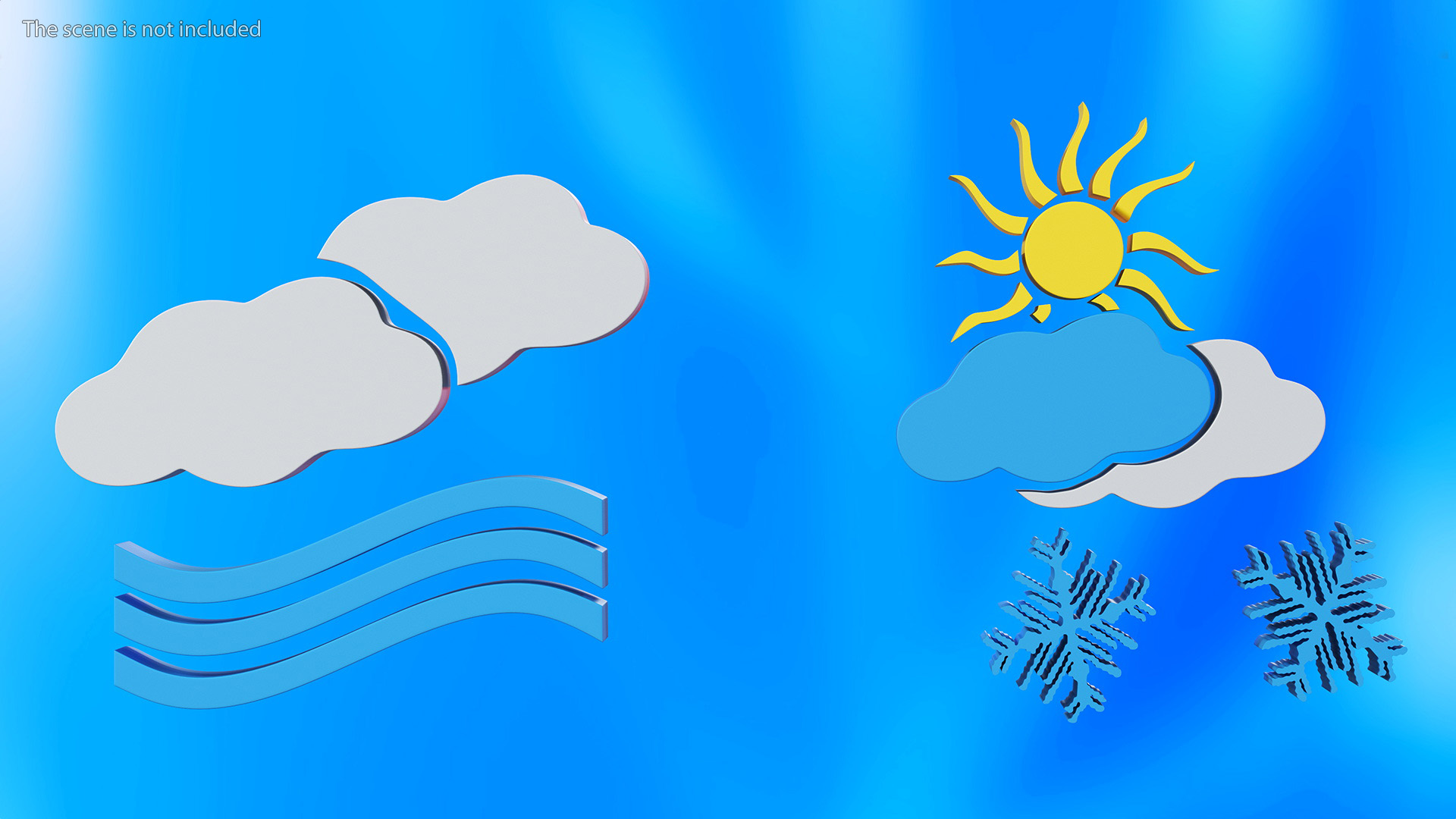 Meteorology Symbols with Snow and Wind Set is a 3D model of collection of special icons which used to represent different weather conditions, such as clouds, sun, wind, snow and rain.