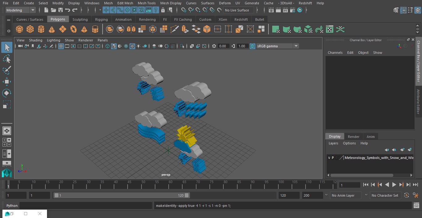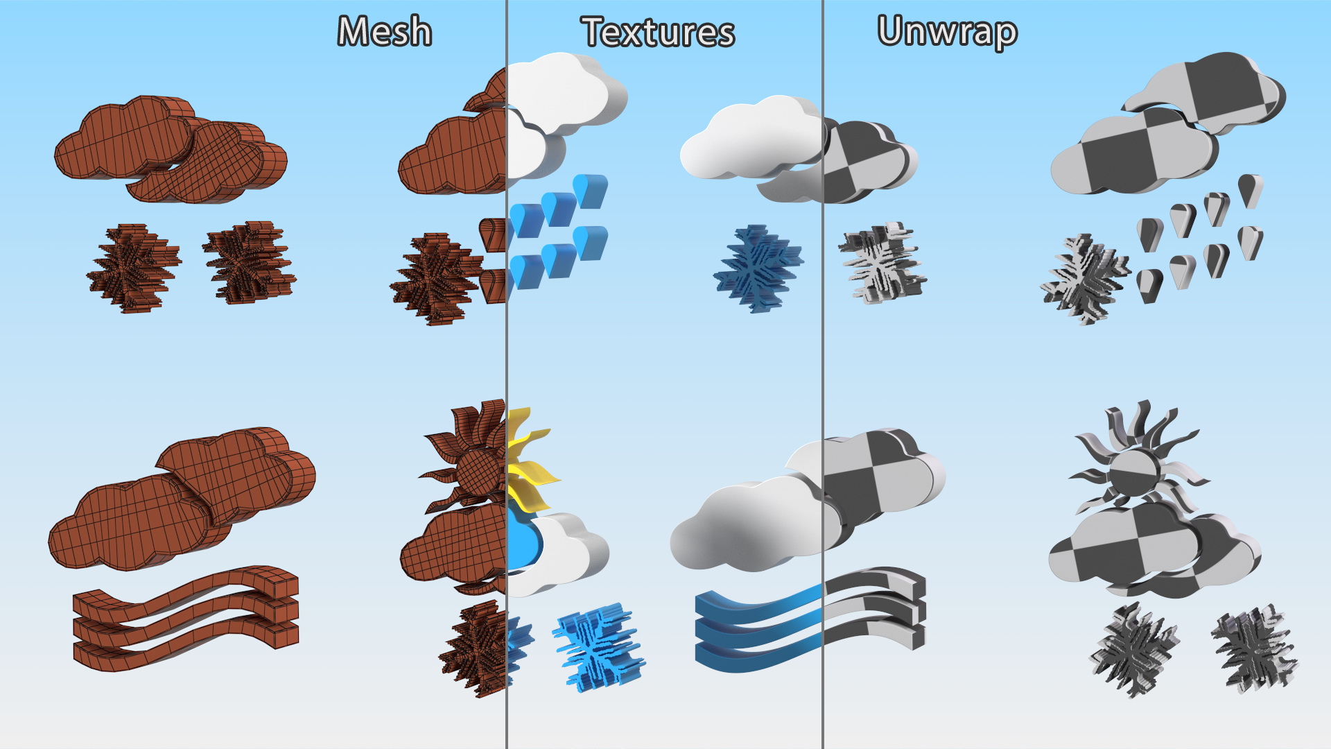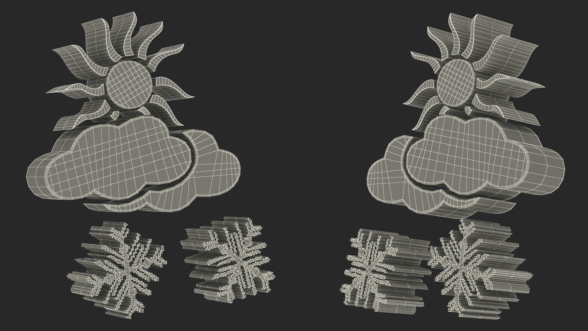 Meteorology Symbols with Snow and Wind Set is a 3D model of collection of special icons which used to represent different weather conditions, such as clouds, sun, wind, snow and rain.