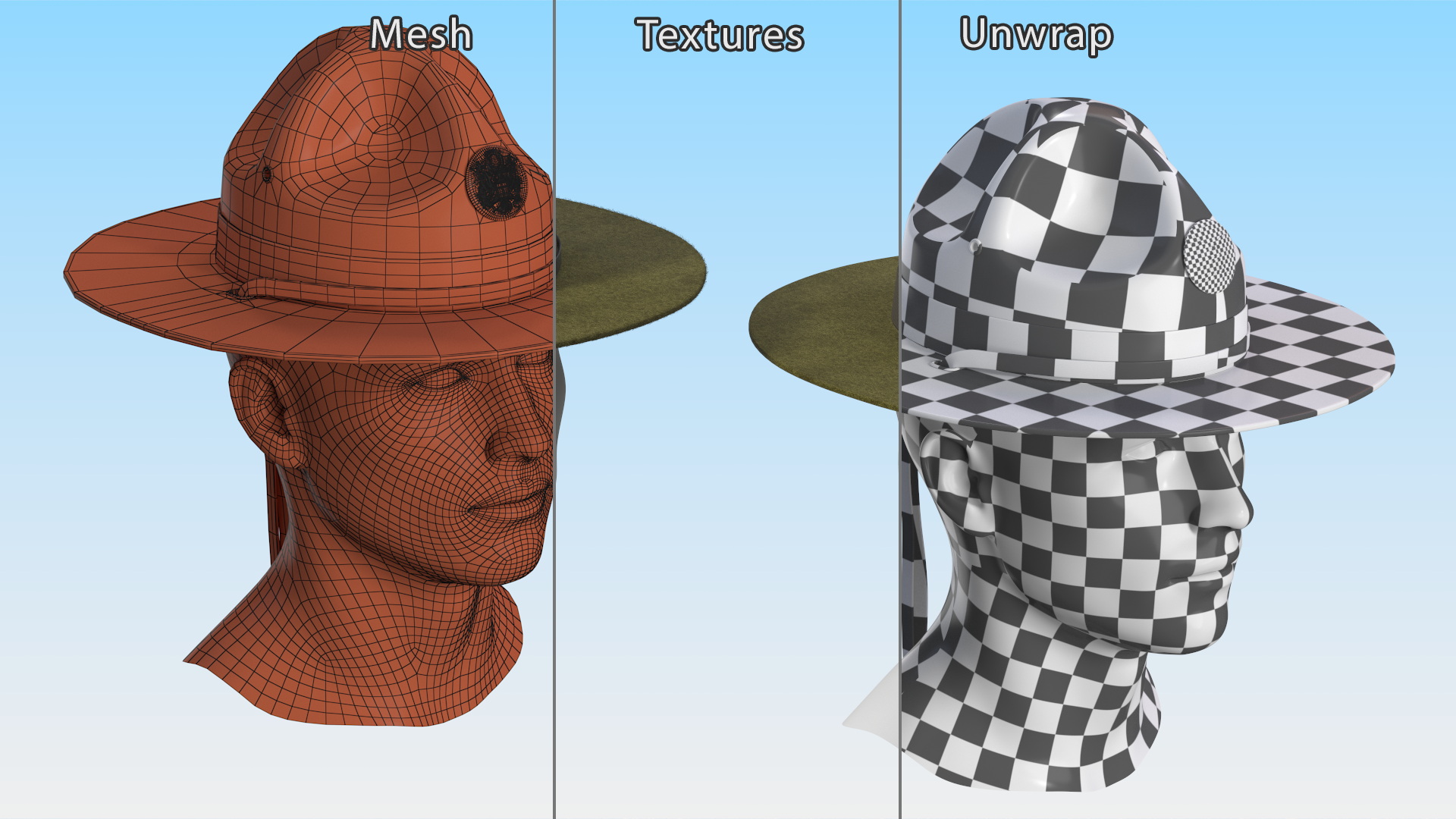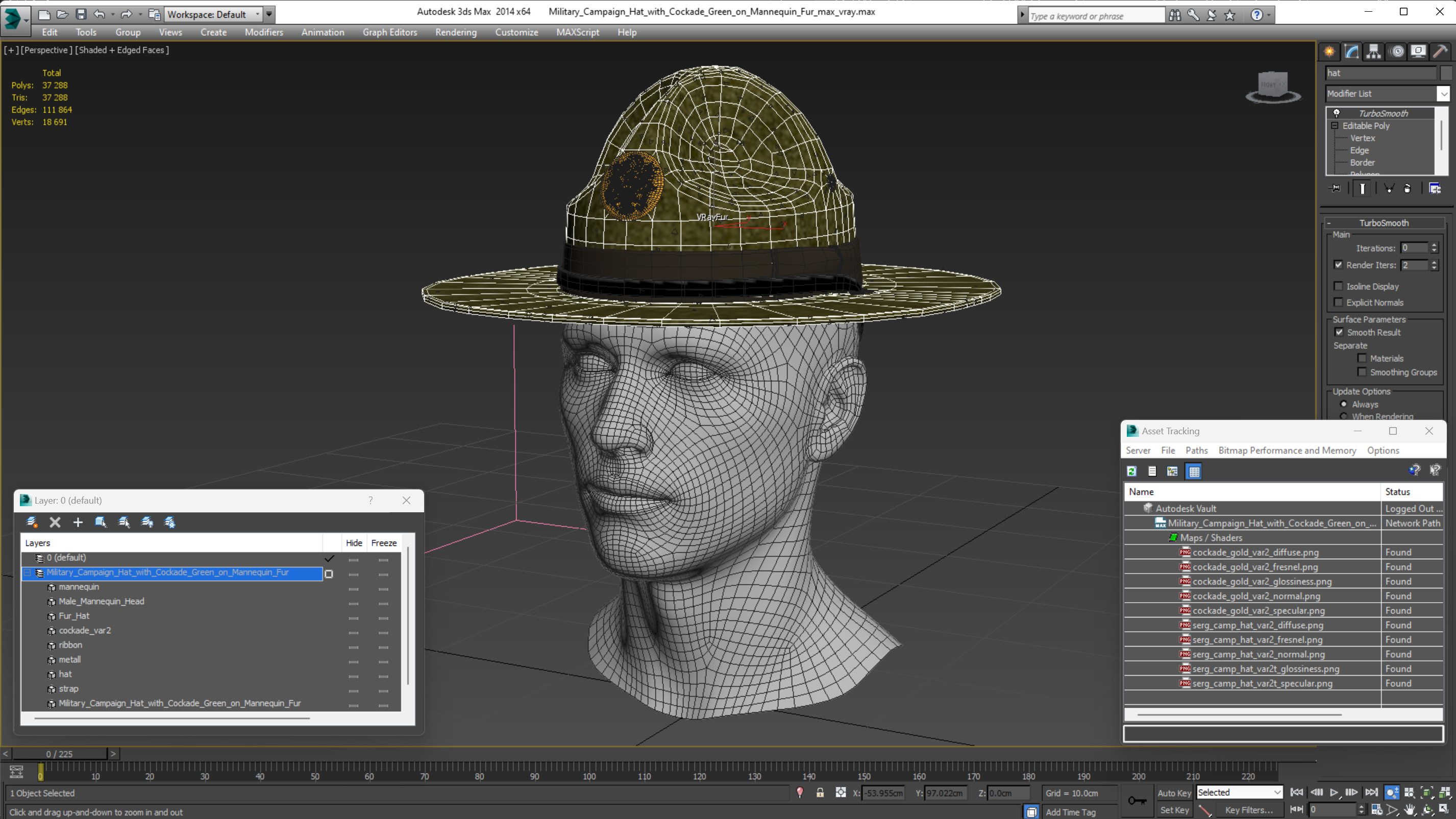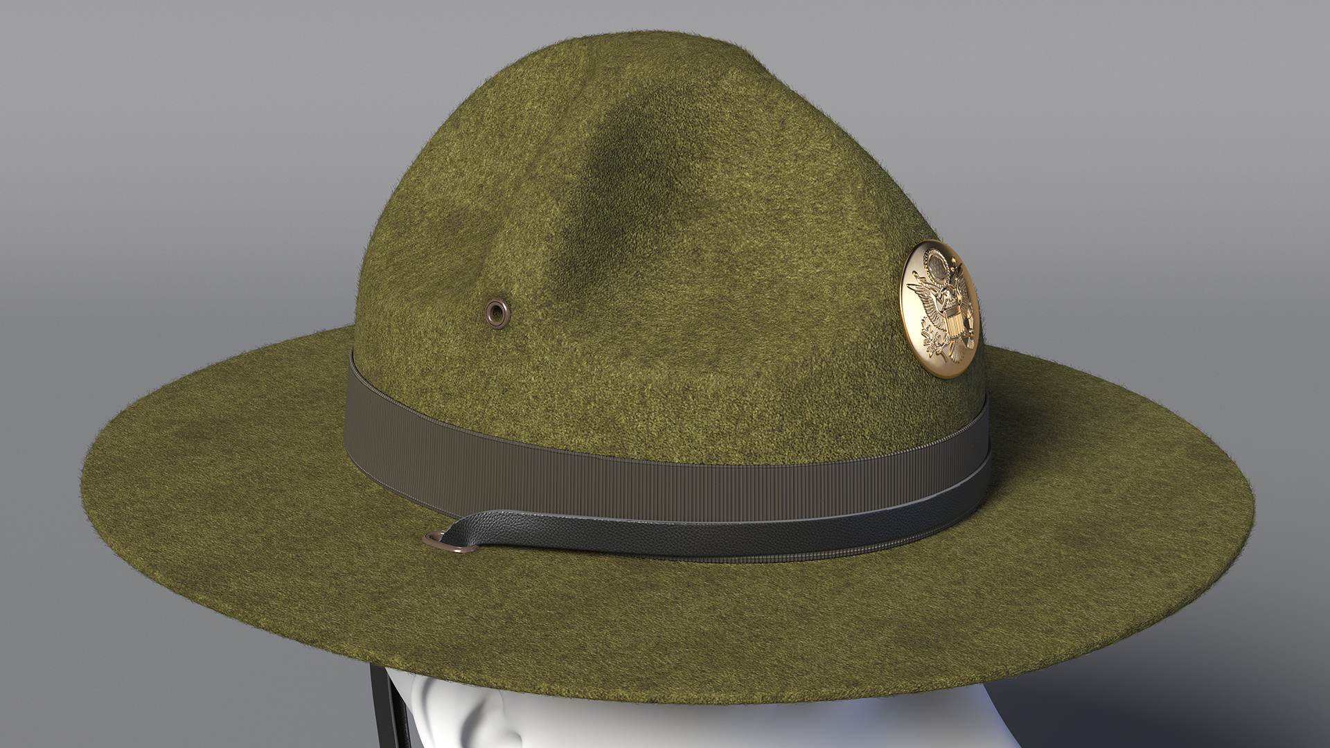 Military Campaign Hat with Cockade Green on Mannequin Fur is a high quality, photo real 3d model that will enhance detail and realism to any of your rendering projects. The model has a fully textured, detailed design that allows for close-up renders, and was originally modeled in 3ds Max 2020 and rendered with V-Ray. Renders have no postprocessing!