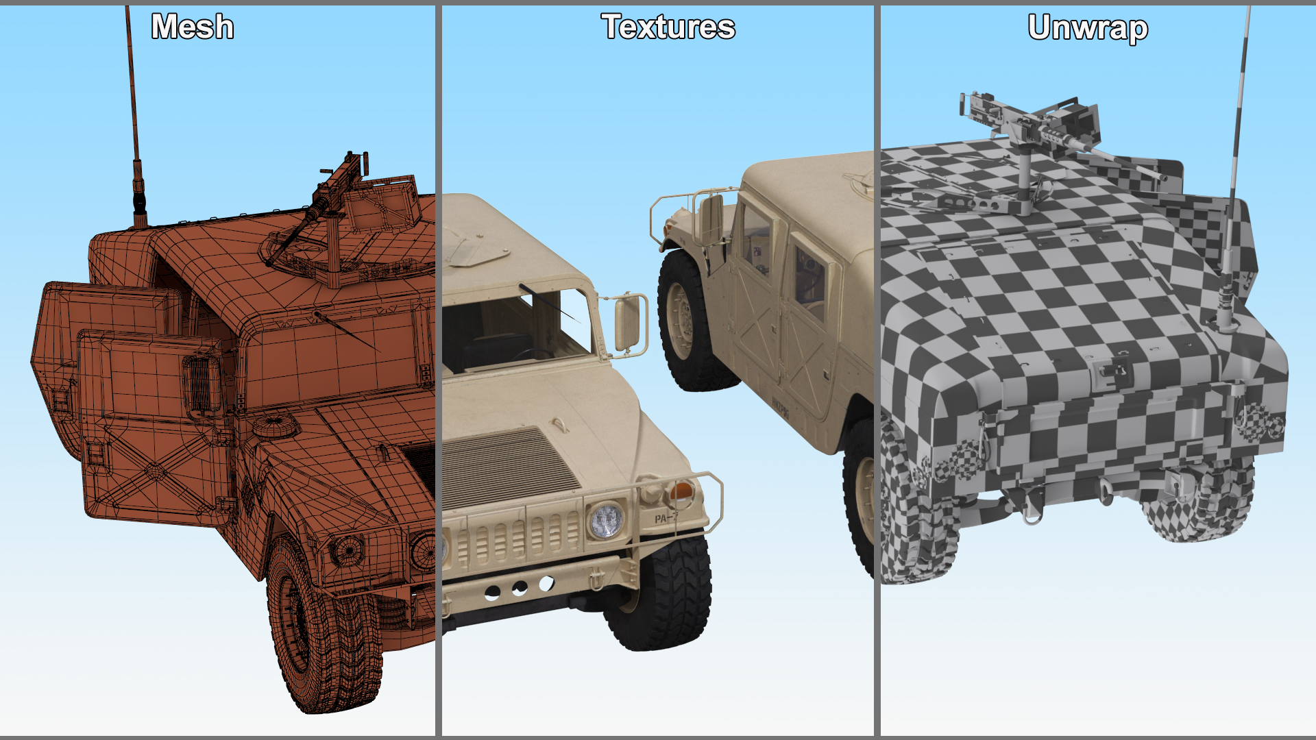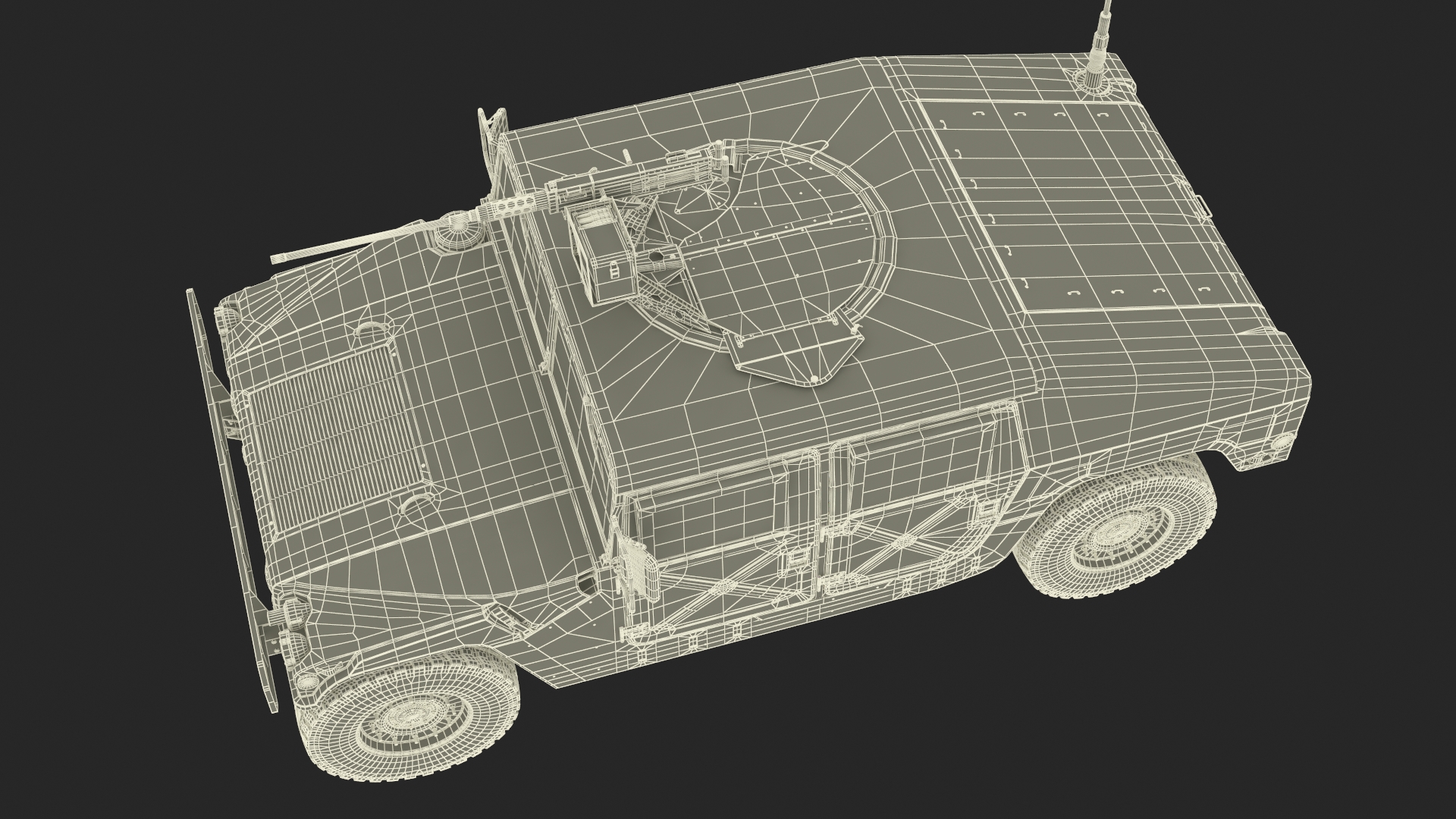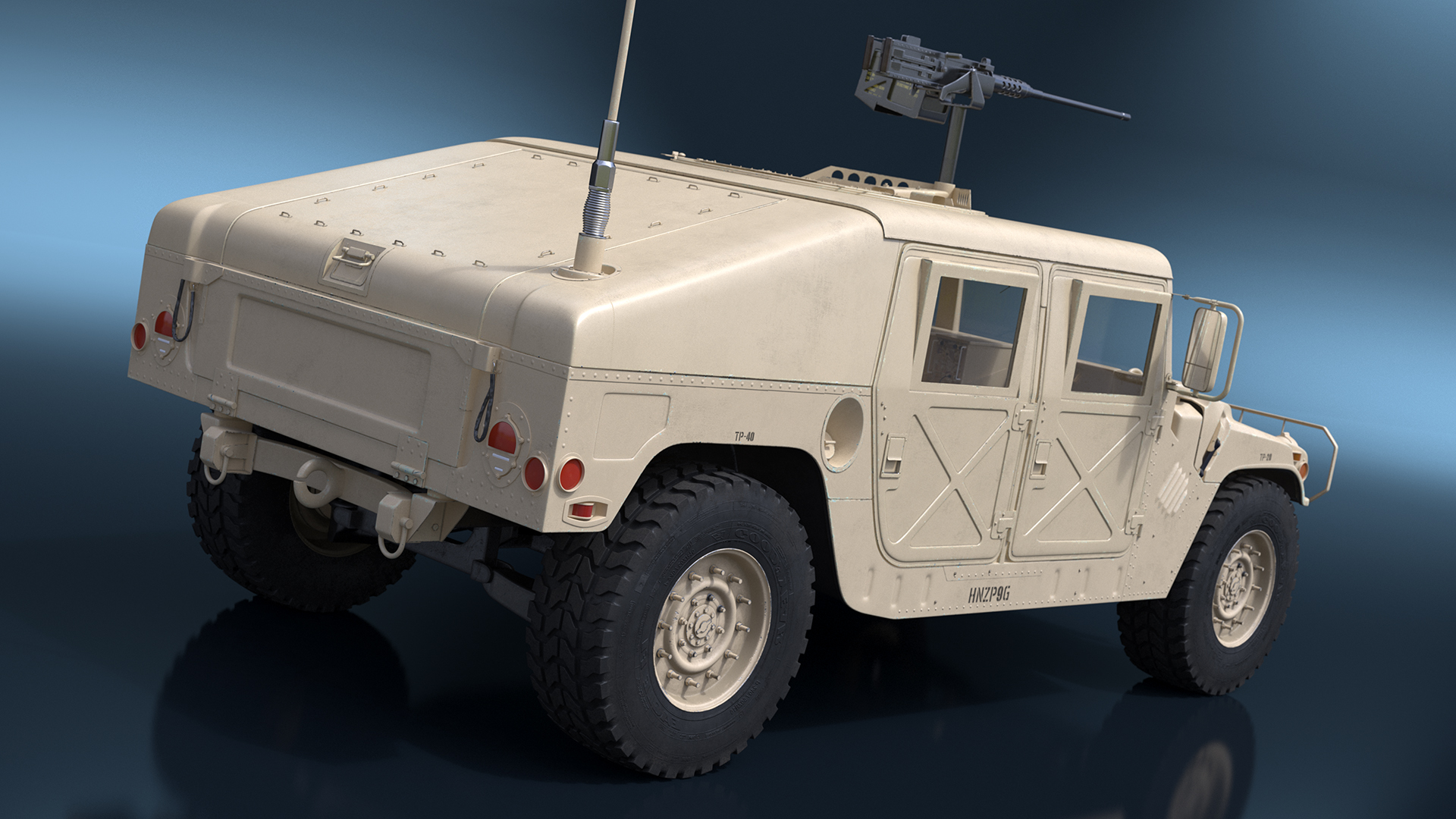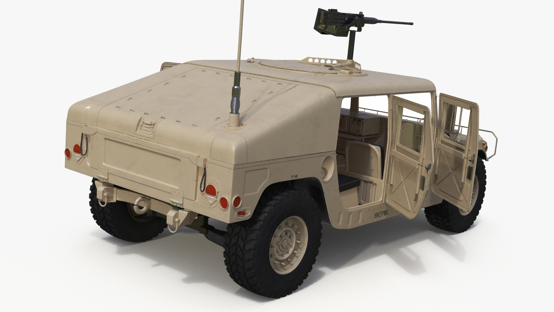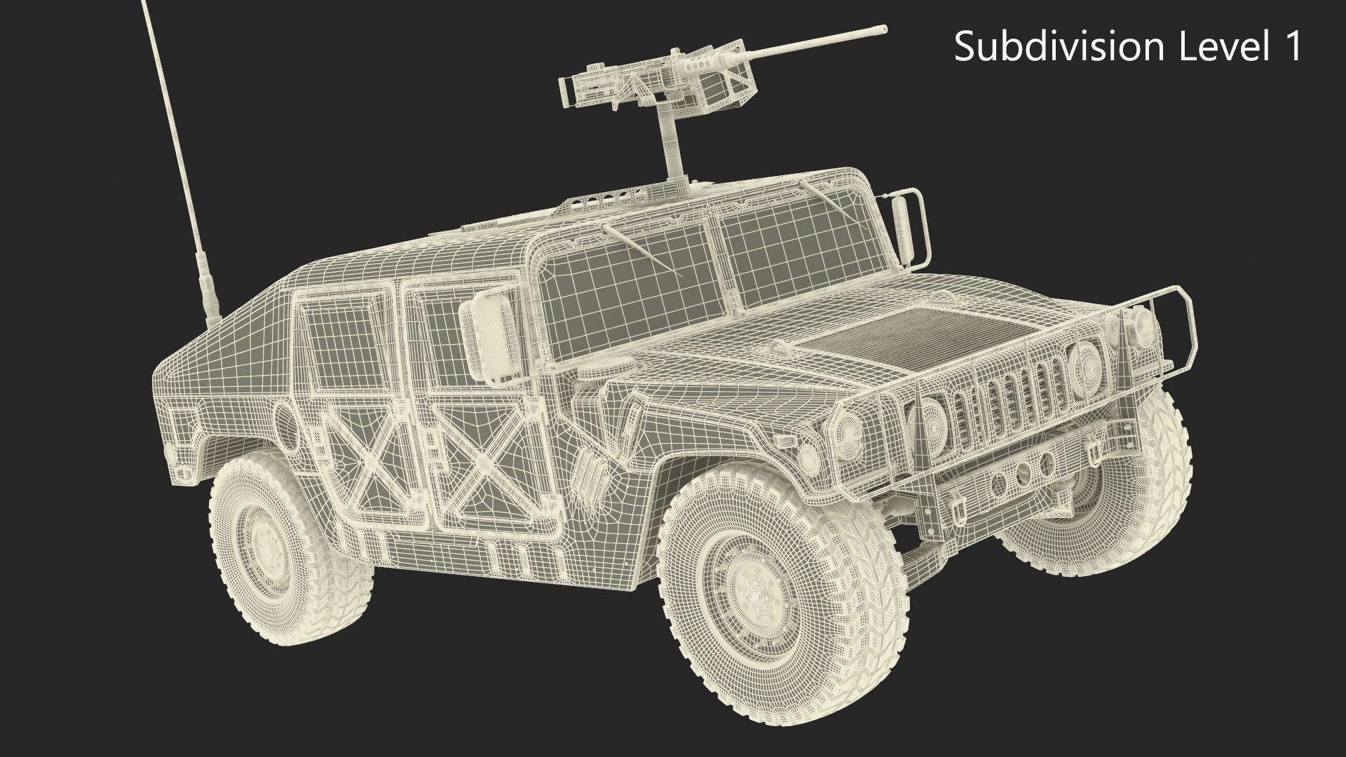 Military Humvee with Mounted Machine Gun is a 3d model of a versatile, all-terrain military transport vehicle equipped with a heavy machine gun for combat support and tactical operations.