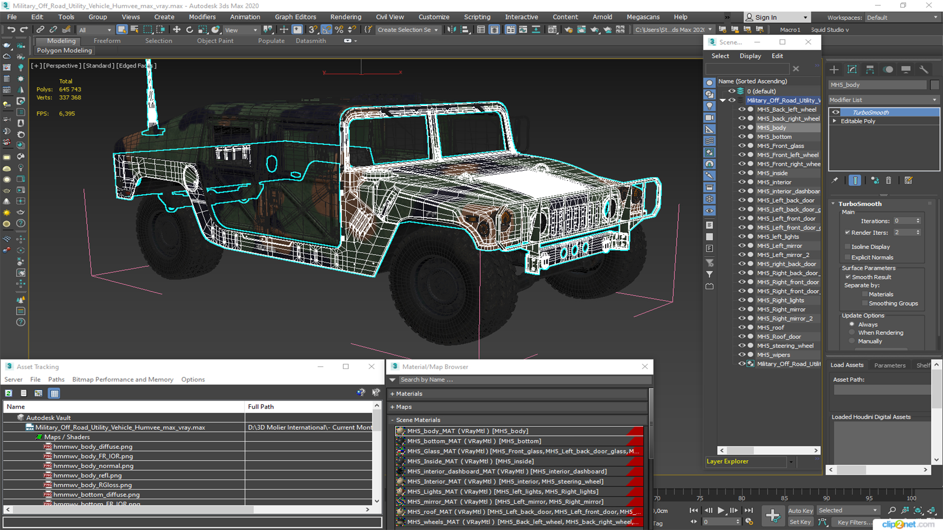 Military Off Road Utility Vehicle Humvee is a high quality, photo real 3d model that will enhance detail and realism to any of your rendering projects. The model has a fully textured, detailed design that allows for close-up renders, and was originally modeled in 3ds Max 2020 and rendered with V-Ray. Renders have no postprocessing!