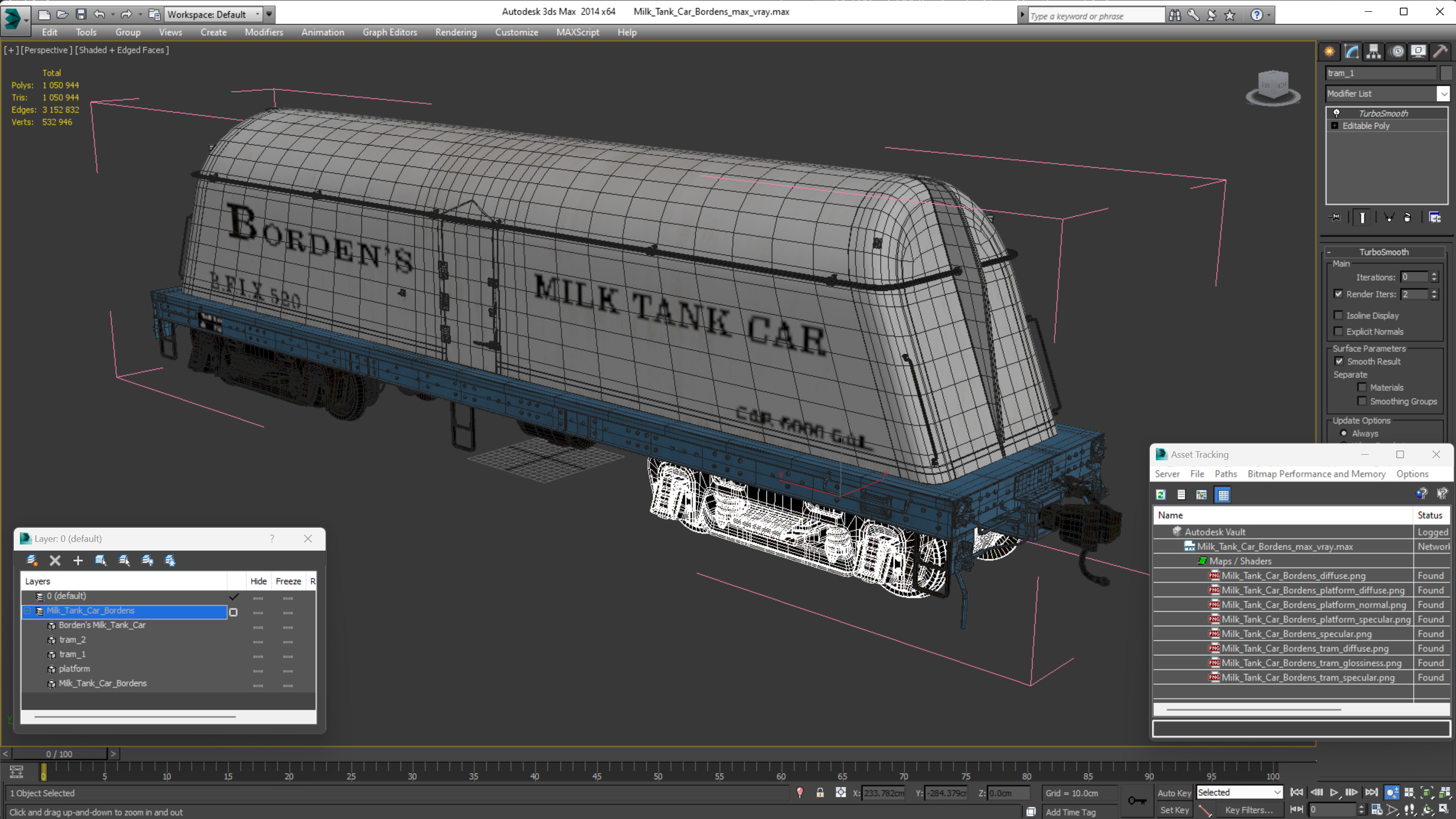 Milk Tank Car Bordens is a 3d model of type of railroad tank car used to transport milk.