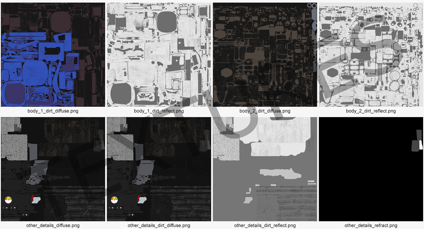 All textures and materials are included and mapped. (All colors can be easily modified.)