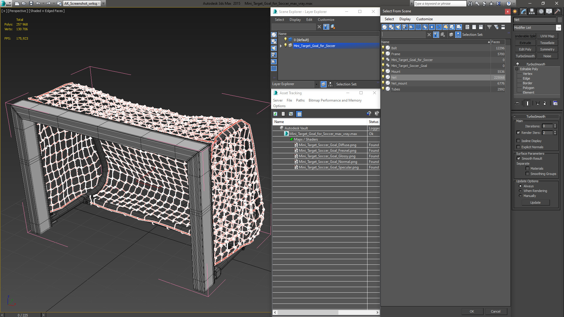 Mini Target Goal for Soccer is a high quality, photo real 3d model that will enhance detail and realism to any of your rendering projects. The model has a fully textured, detailed design that allows for close-up renders, and was originally modeled in 3ds Max 2020 and rendered with V-Ray. Renders have no postprocessing!