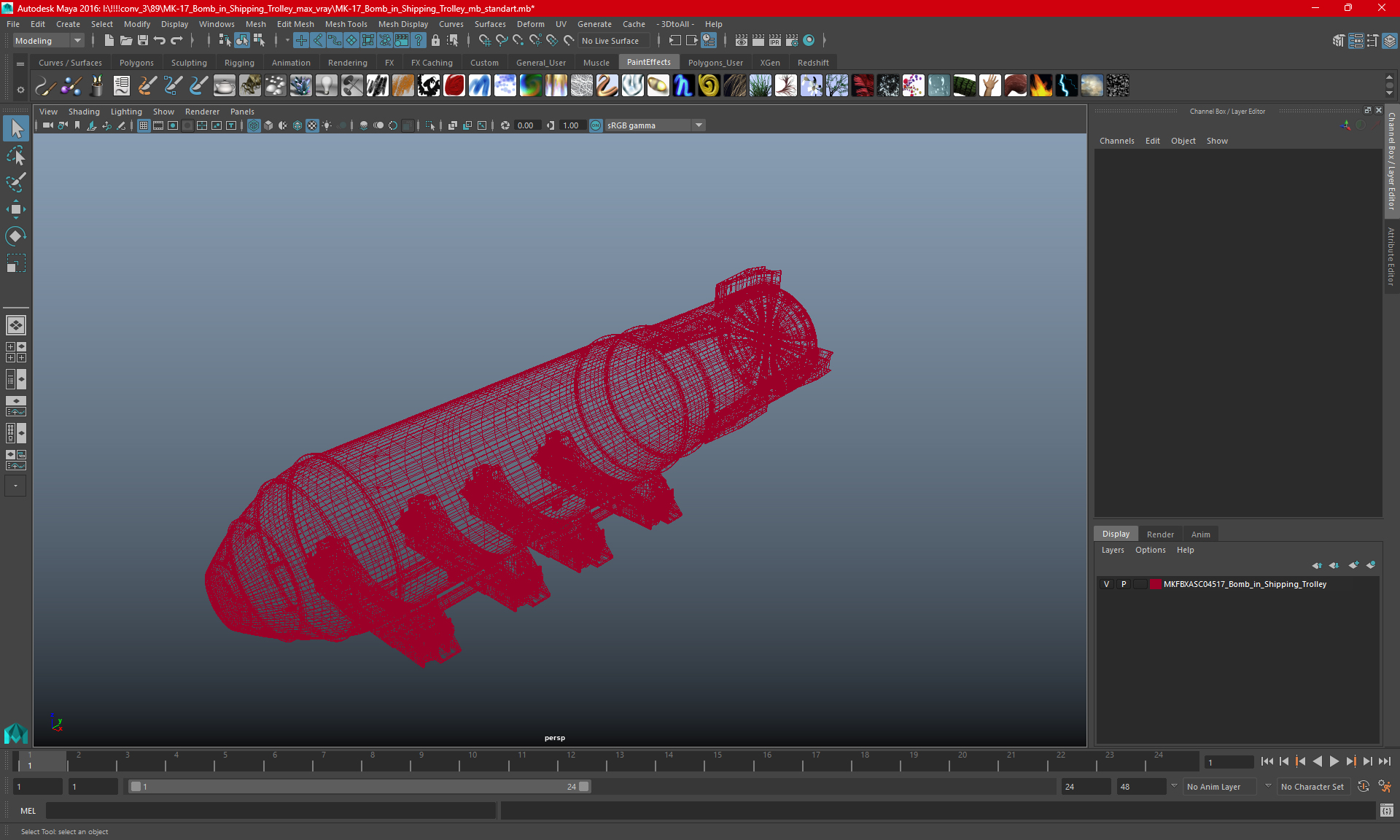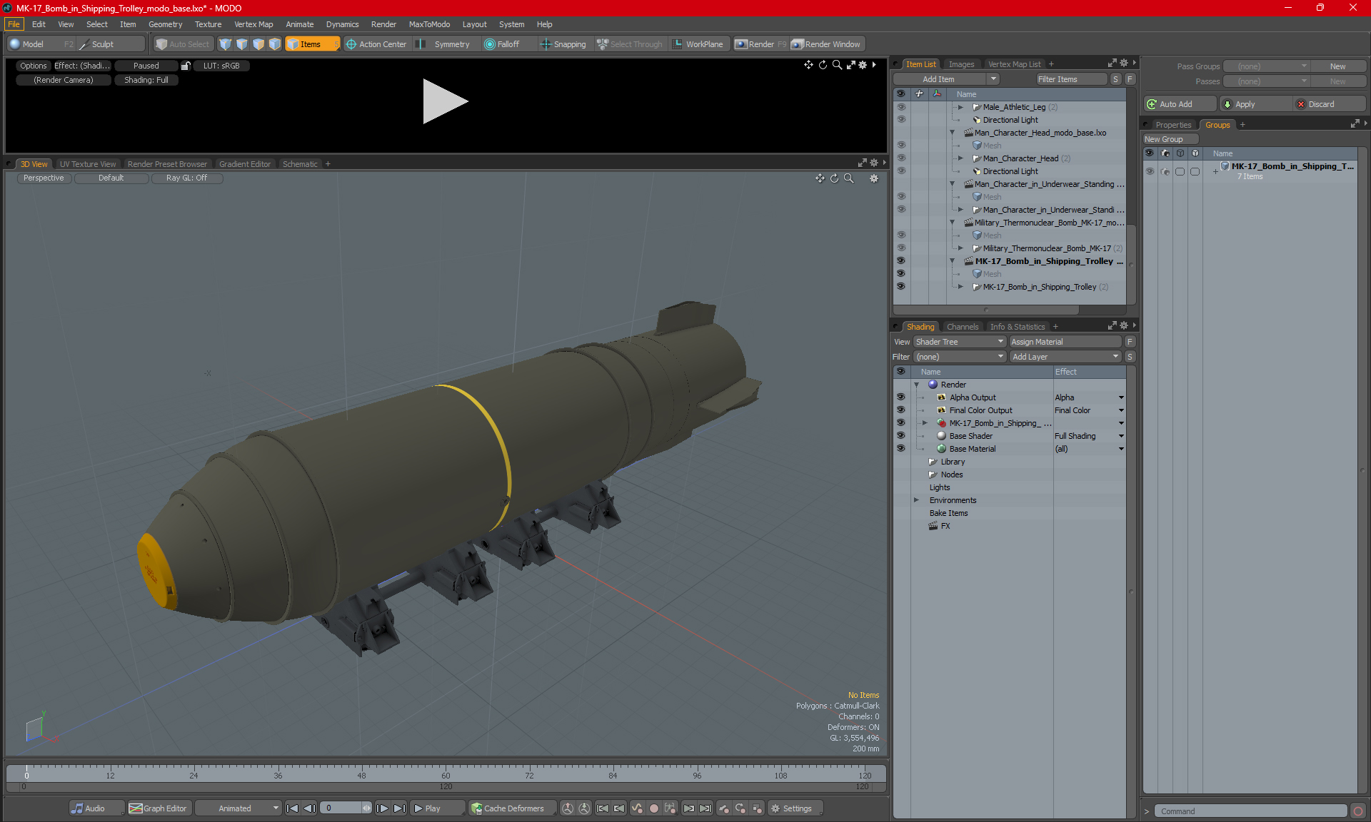 MK-17 Bomb in Shipping Trolley is a high quality, photo real 3d model that will enhance detail and realism to any of your rendering projects. The model has a fully textured, detailed design that allows for close-up renders, and was originally modeled in 3ds Max 2020 and rendered with V-Ray. Renders have no postprocessing!