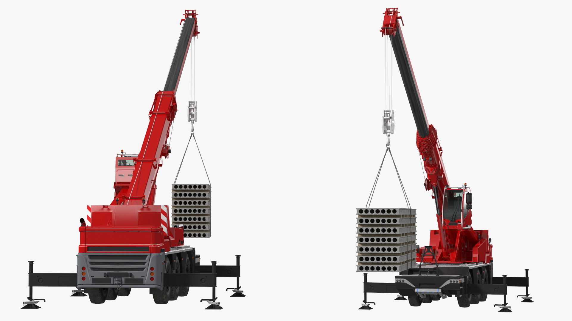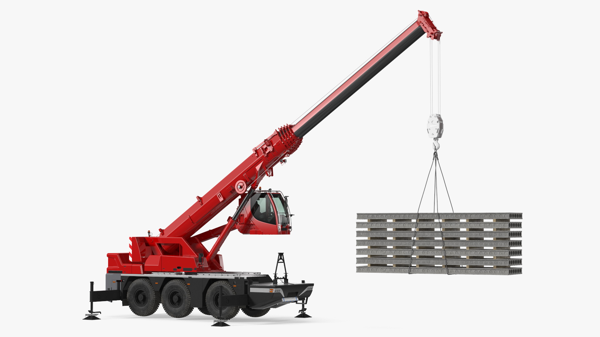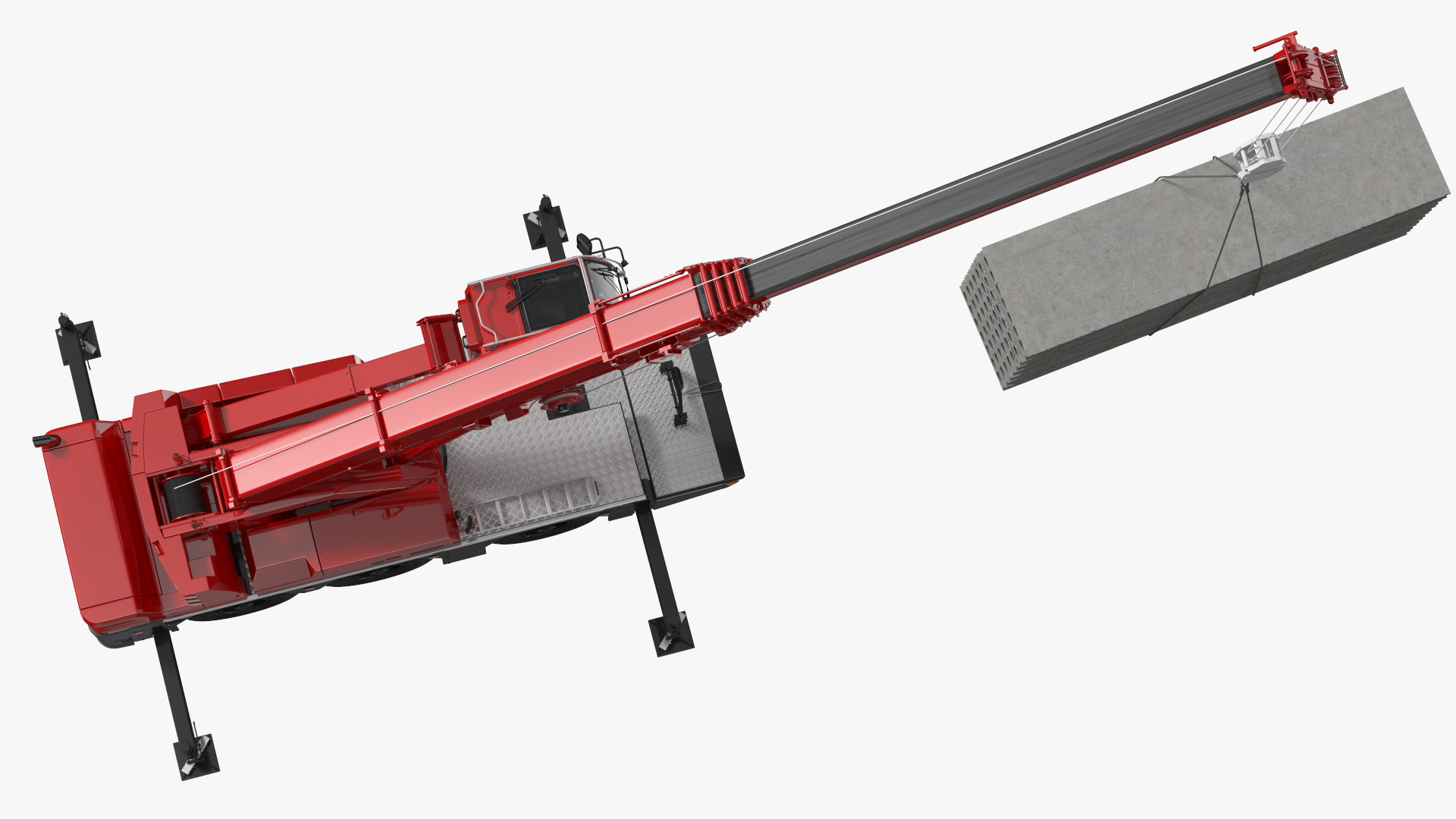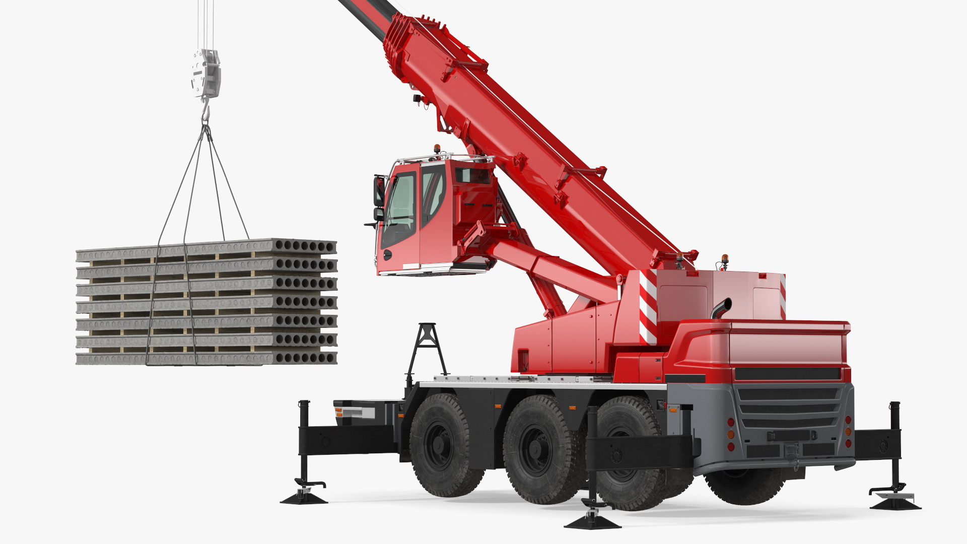 Mobile Crane With Concrete Slab Rigged is a three-dimensional model of a high mobility, contemporary crane machinery with load, which is a stack of construction concrete elements.