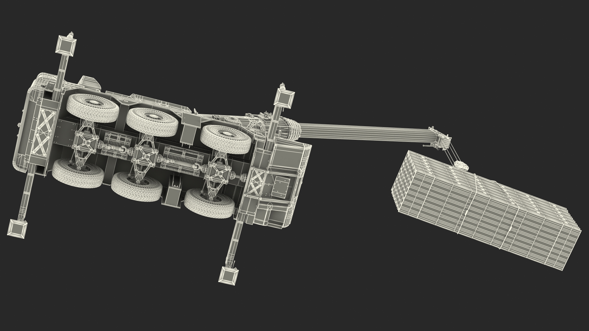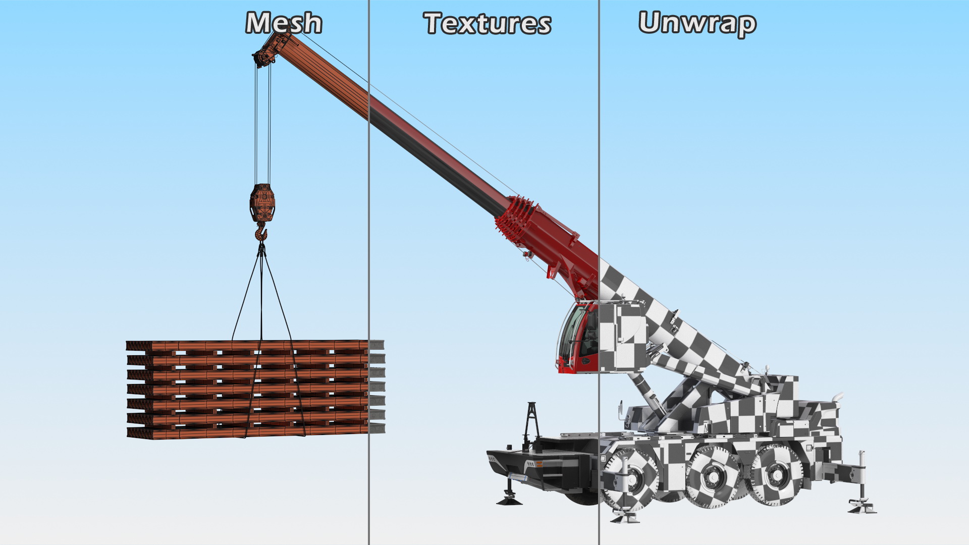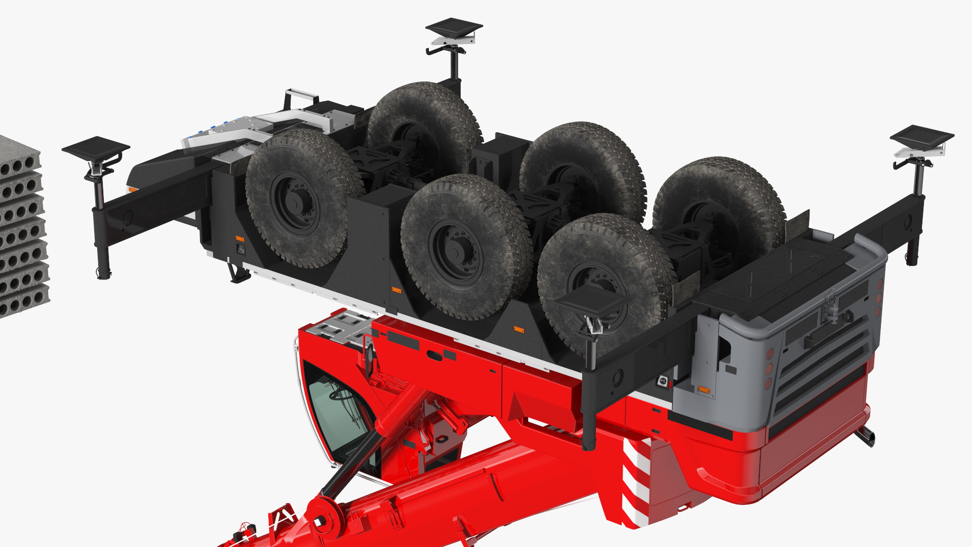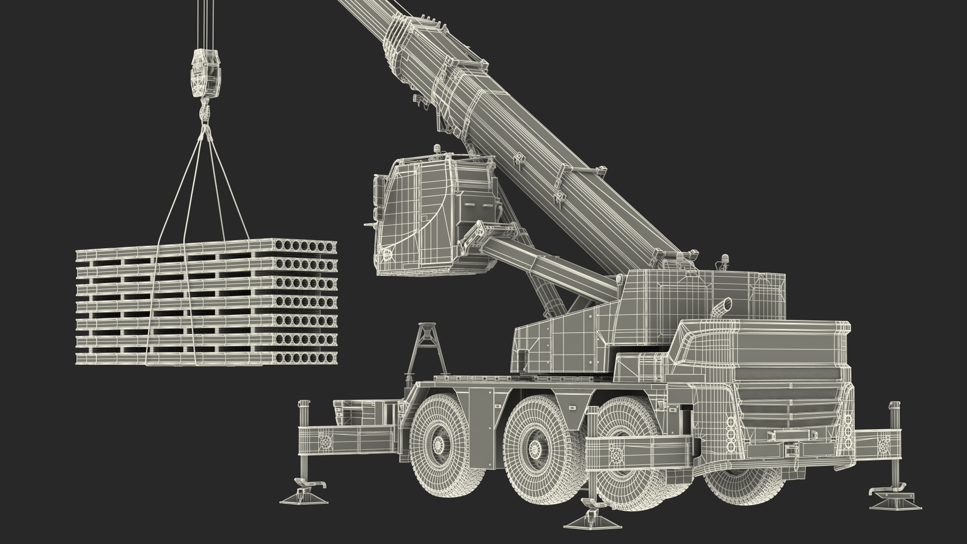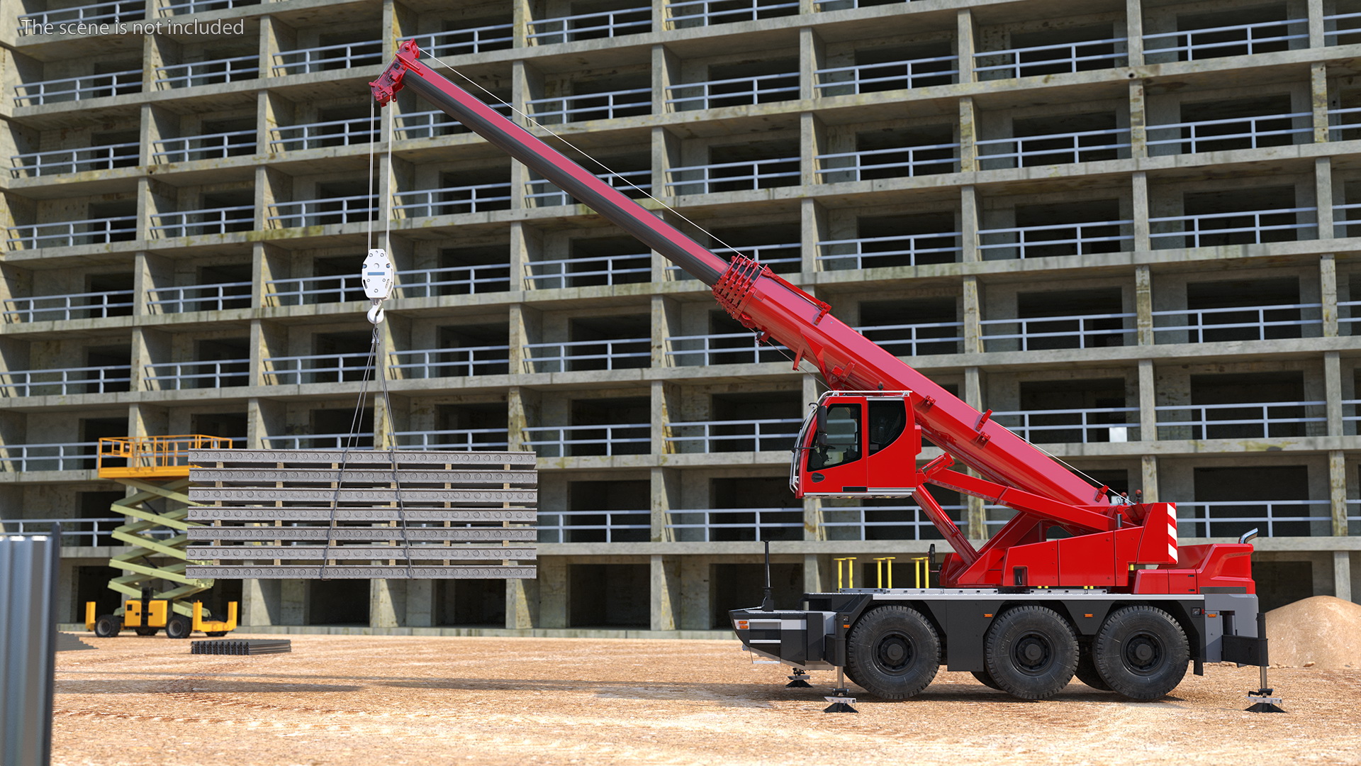 Mobile Crane With Concrete Slab Rigged is a three-dimensional model of a high mobility, contemporary crane machinery with load, which is a stack of construction concrete elements.