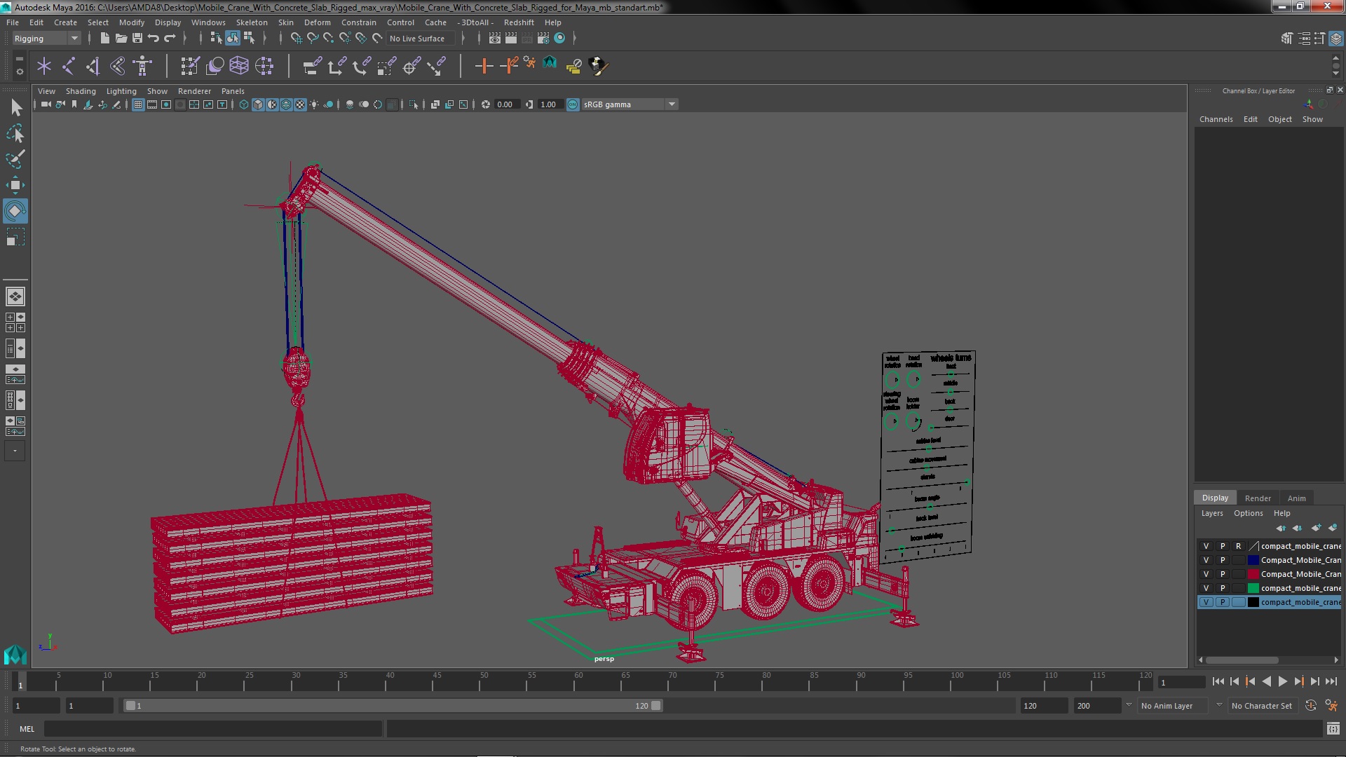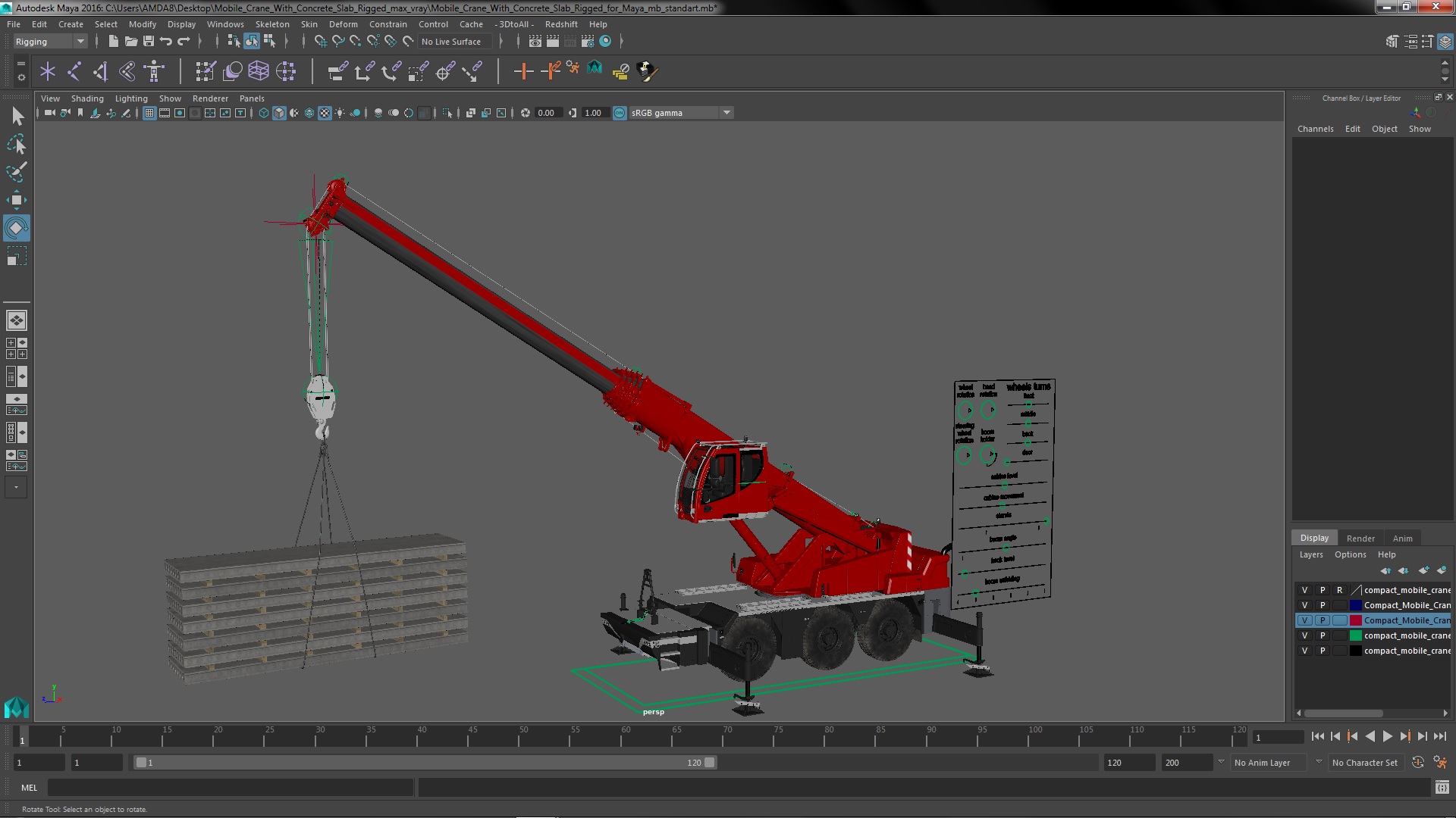 Mobile Crane With Concrete Slab Rigged for Maya is fully rigged and is ready to be animated in Maya. You can easily position it the way you need or animate it the way your project requires. See the screenshots to get an idea of how rigging works. The pose of the model on the render images is an example and can be recreated using rig, it is not initially included into the product.