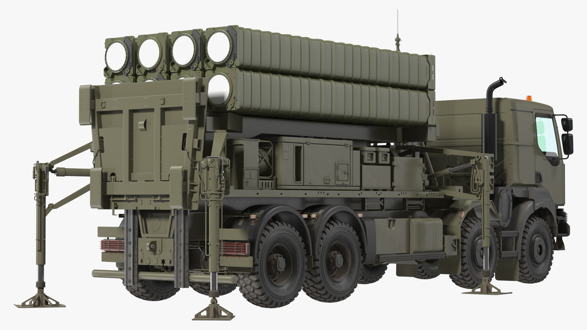 Surface-to-air range the special land-based air defence system used against high-speed threats such as air missiles, tactical ballistic missiles, combat aircraft, cruise missiles, and UCAVs (UAV, unmanned combat air vehicles, or military drones) with heavy duty or heavy utility, 8x8 wheeled truck vehicle.