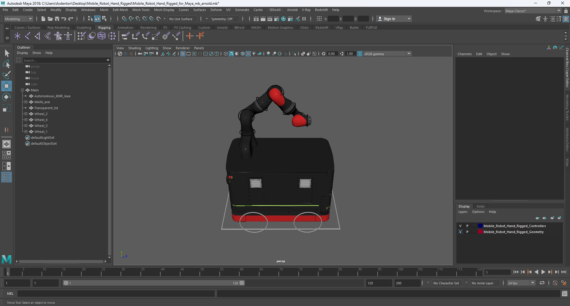 Mobile Robot Hand Rigged is a three-dimensional model of mobile robotics arm, that is an intelligent industrial work assistant, and that is a lightweight industrial robot type arm with the mobile platform (autonomous transportation solution).