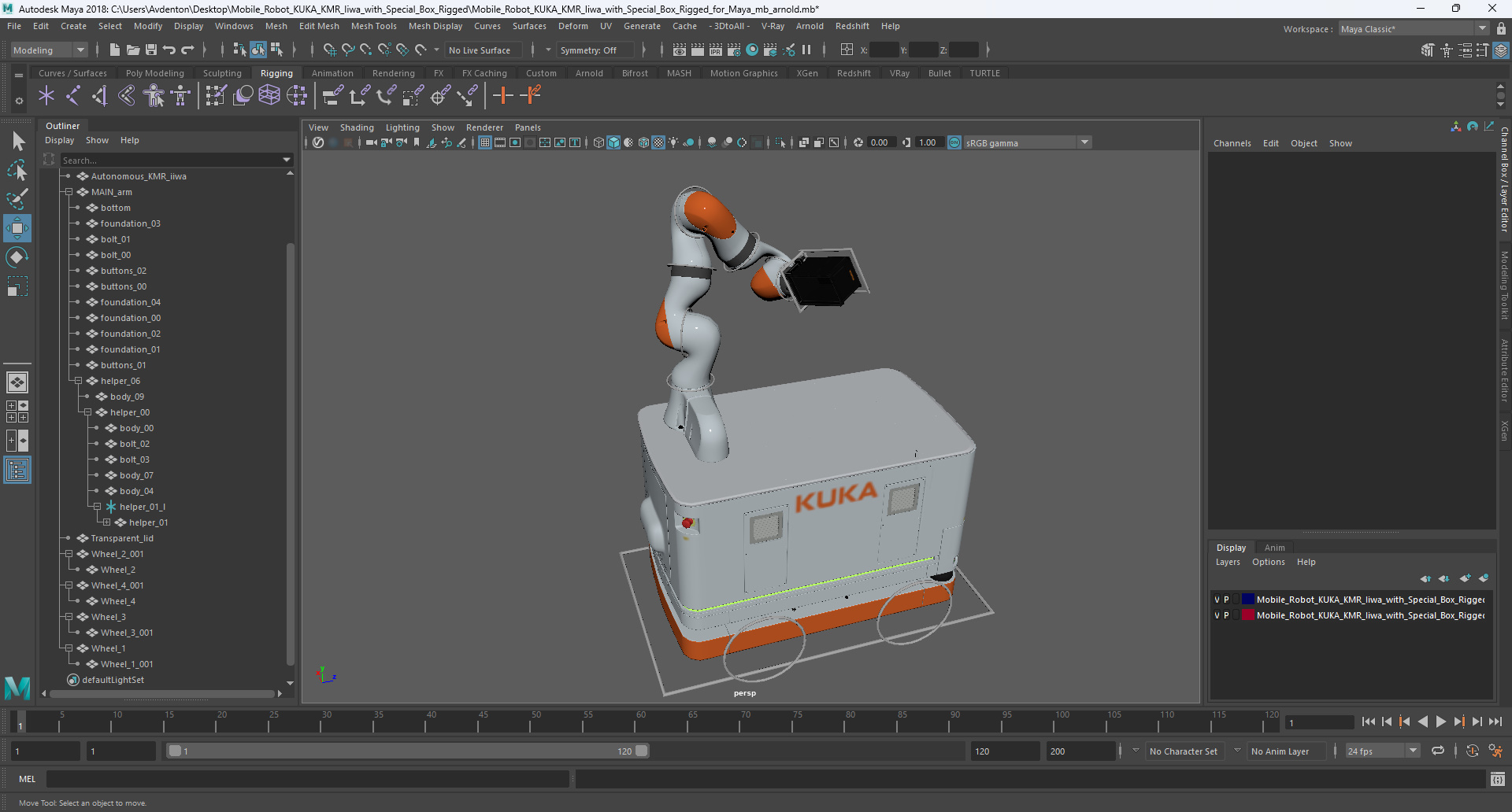Mobile Robot KUKA KMR Iiwa with Special Box Rigged for Maya is fully rigged and is ready to be animated in Maya. You can easily position it the way you need or animate it the way your project requires. See the screenshots to get an idea of how rigging works. The pose of the model on the render images is an example and can be recreated using rig, it is not initially included into the product.