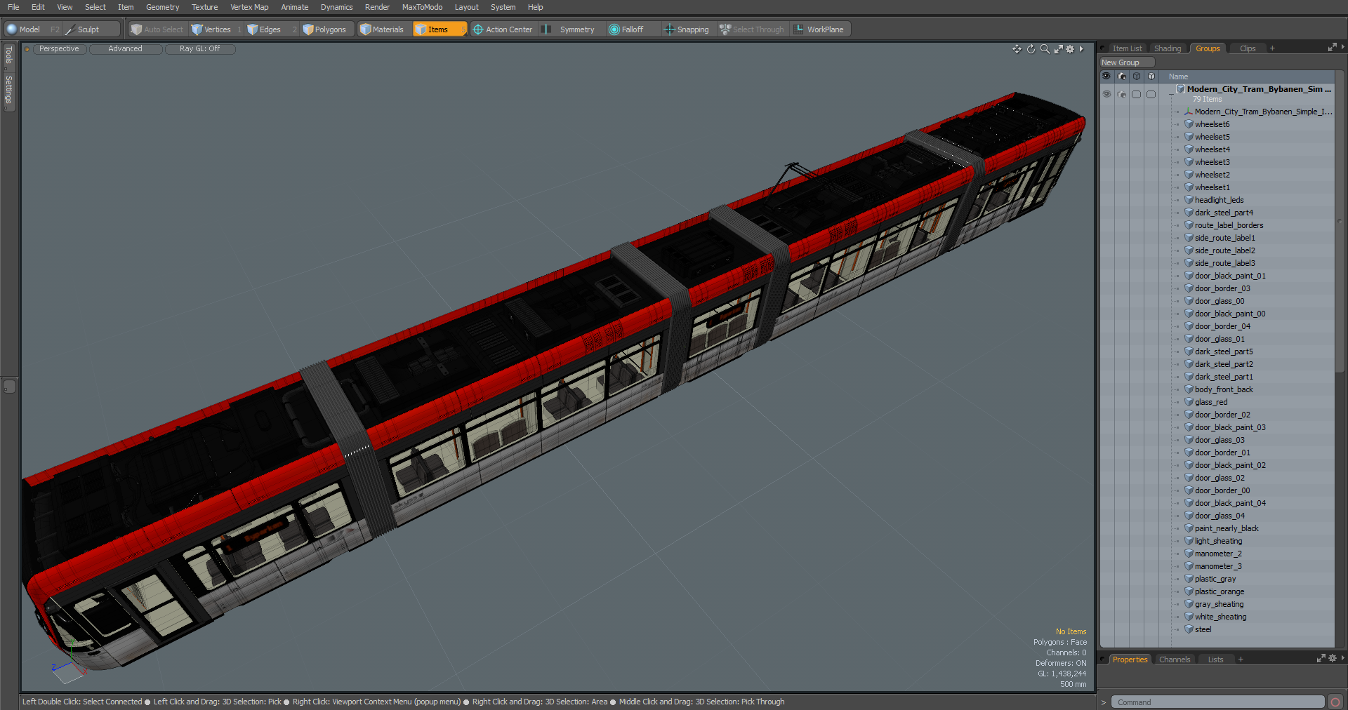 Modern City Tram Bybanen Simple Interior is a three-dimensional model of modern city tram (light rail train, streetcar, trolley or trolleycar) that is an urban light rail vehicle, and that is electric light railroad transport unit with wagons and locomotive.