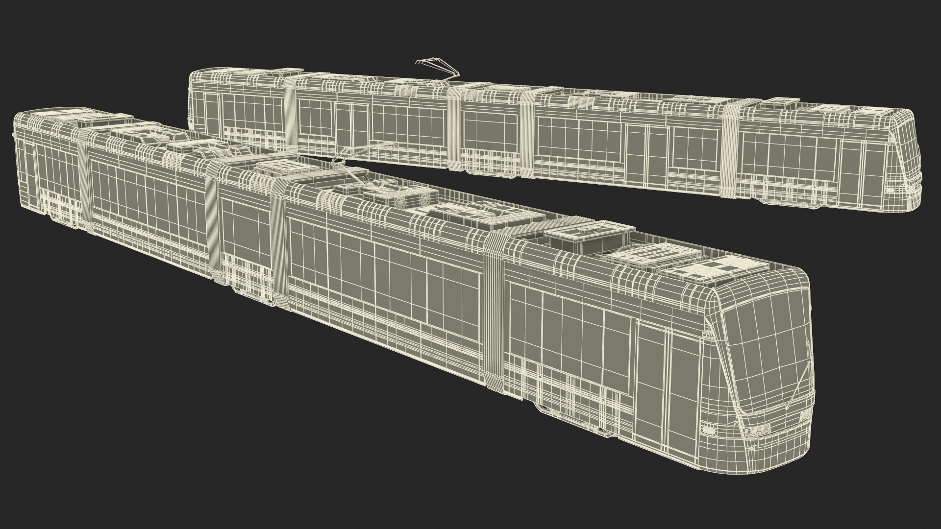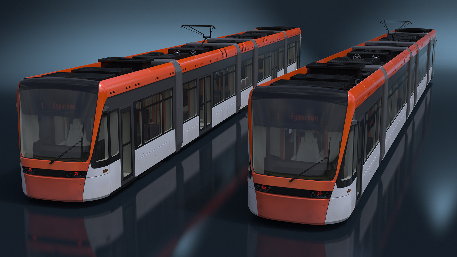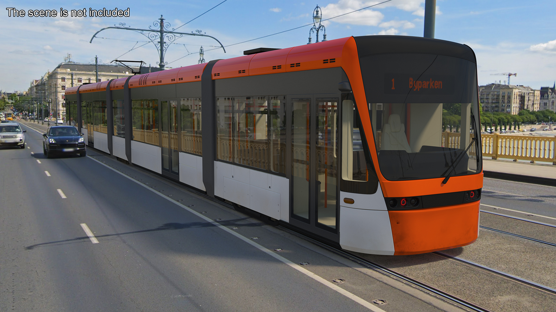 A modern city tram that is an electrically powered light rail vehicle, commonly seen on public streets. It runs on dedicated tracks and is designed to transport passengers within urban and suburban areas. Known as streetcars or trolleys, trams are eco-friendly, reducing the need for cars and providing a reliable, low-emission option for city transit.