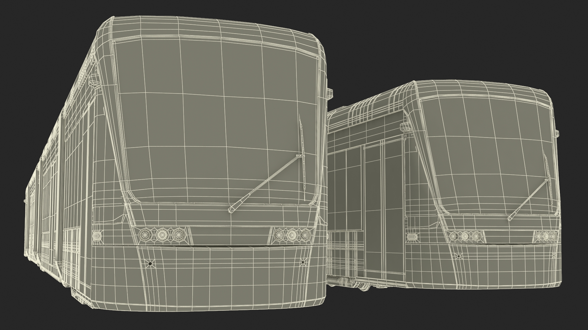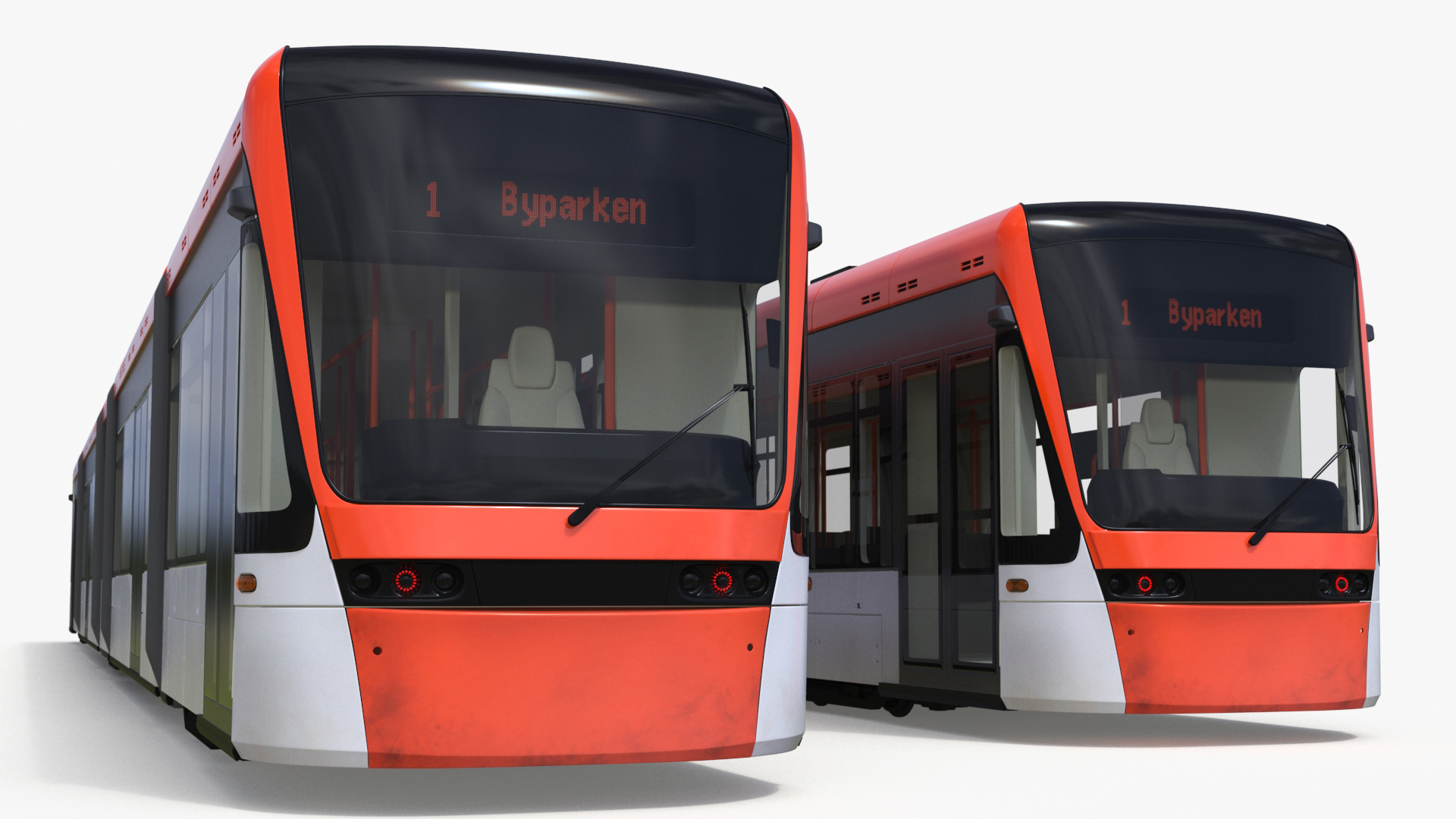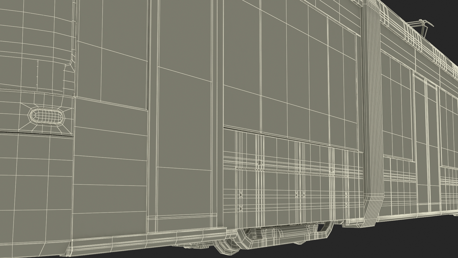 A modern city tram that is an electrically powered light rail vehicle, commonly seen on public streets. It runs on dedicated tracks and is designed to transport passengers within urban and suburban areas. Known as streetcars or trolleys, trams are eco-friendly, reducing the need for cars and providing a reliable, low-emission option for city transit.