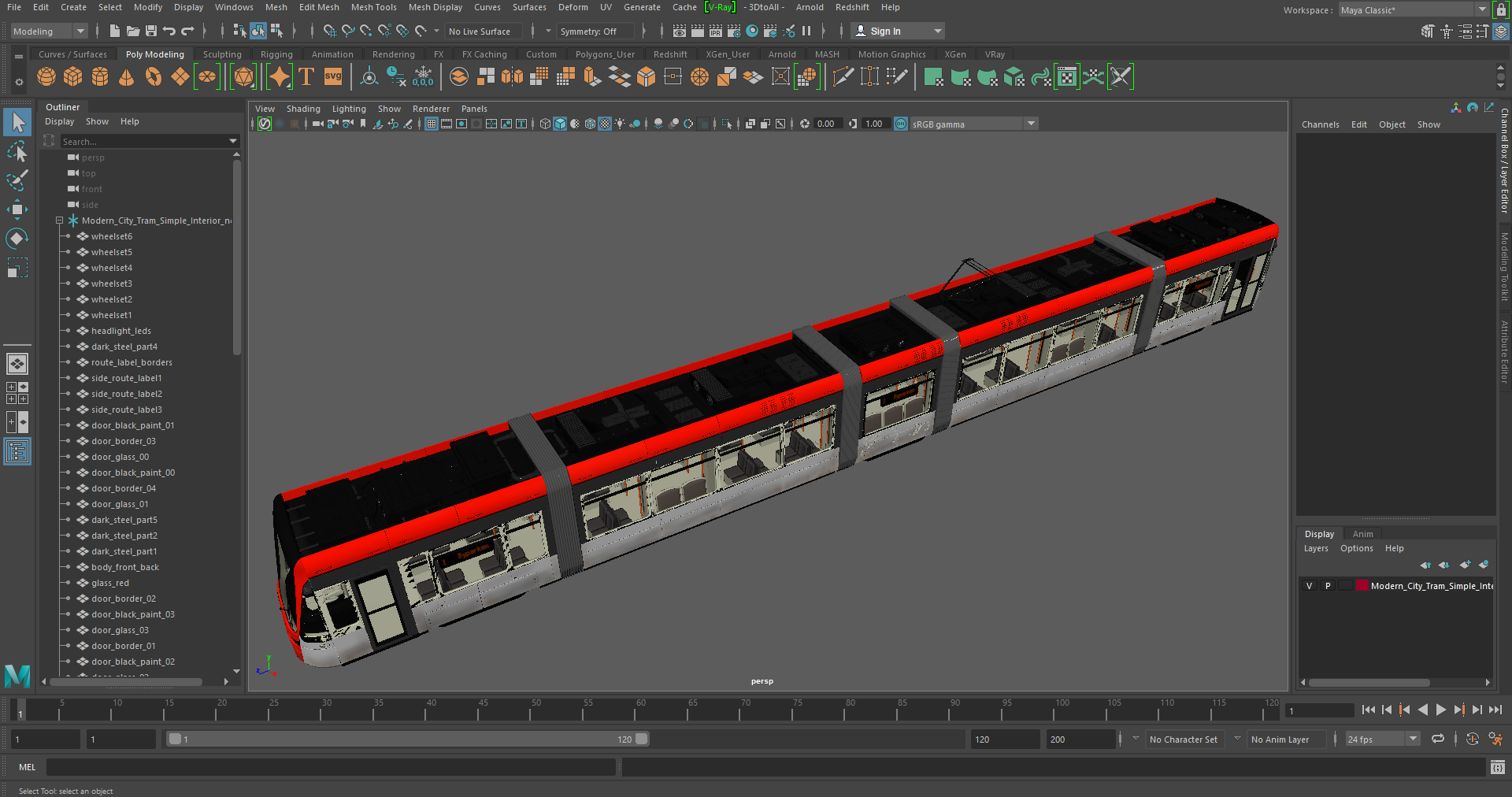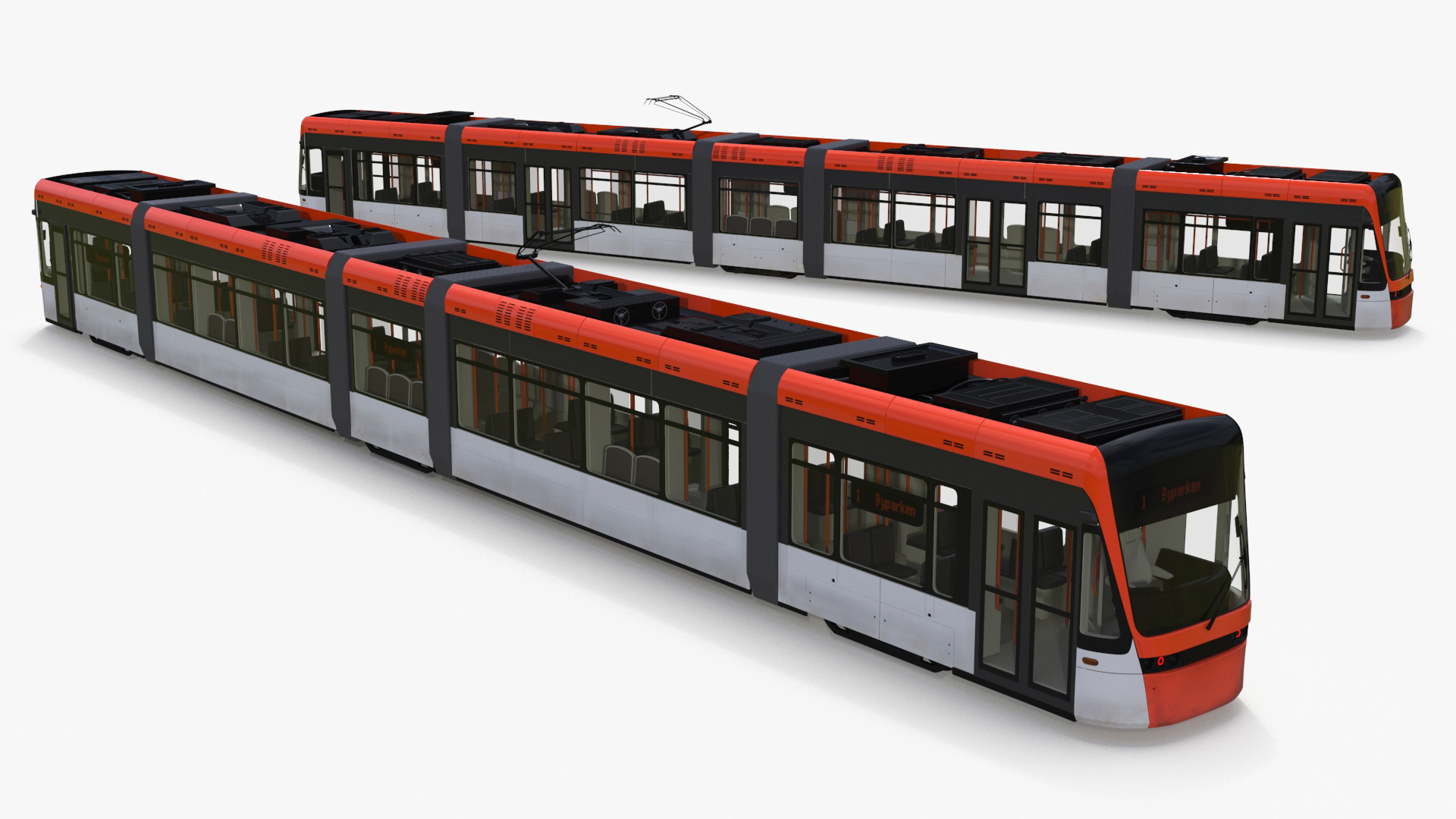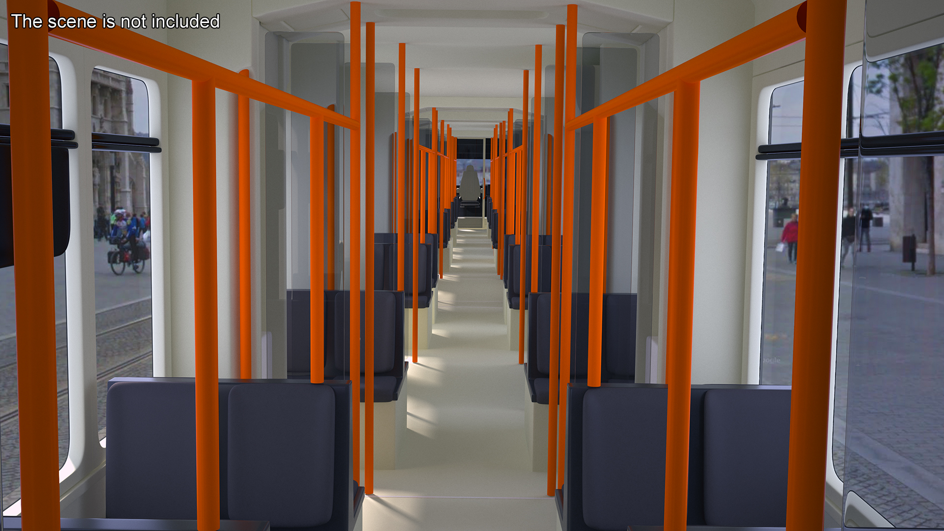 Modern City Tram Simple Interior is a three-dimensional model of modern city tram (light rail train, streetcar, trolley or trolleycar) that is an urban light rail vehicle, and that is electric light railroad transport unit with wagons and locomotive.