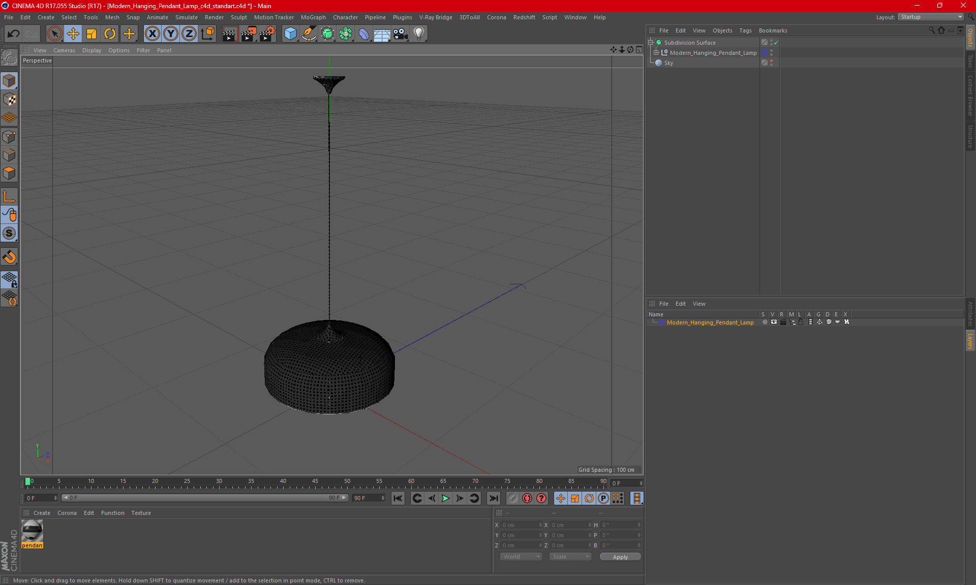 Modern Hanging Pendant Lamp is a three-dimensional model of modern style illuminating device which is a contemporary lighting fixture, and which is a ceiling hanging pendant lamp, and which is a type of light fixture suspended from the ceiling by a cord.