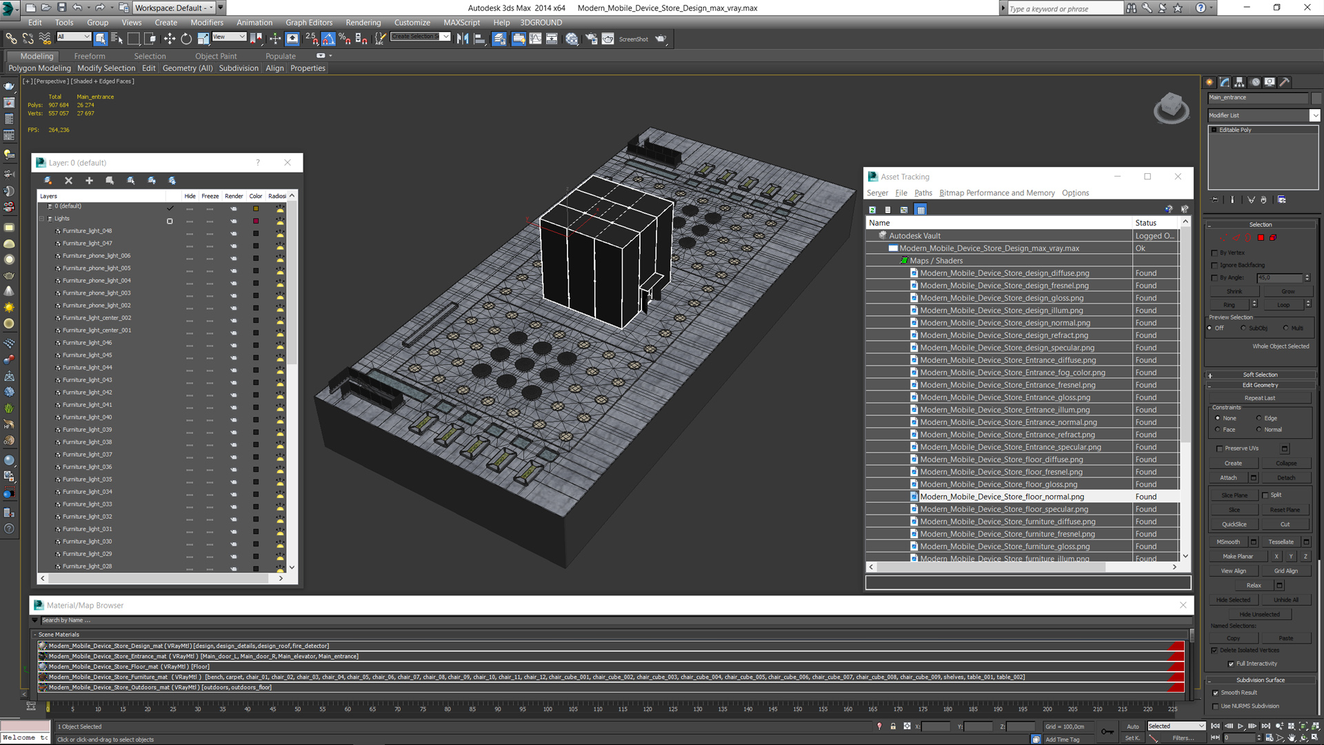 Modern Mobile Device Store Design is a high quality, photo real 3d model that will enhance detail and realism to any of your rendering projects. The model has a fully textured, detailed design that allows for close-up renders, and was originally modeled in 3ds Max 2020 and rendered with V-Ray. Renders have no postprocessing!