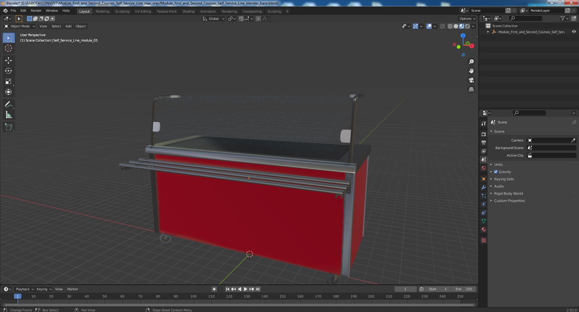 Module First and Second Courses Self Service Line is a 3D model of self-service display counter (part of display line unit) which is a sample of equipment which can be used in commercial and institutional food service settings, such as restaurants, cafeteria business, cafe business, elementary school cafeterias, junior high school cafeterias, grade school cafeterias, and school buffets.