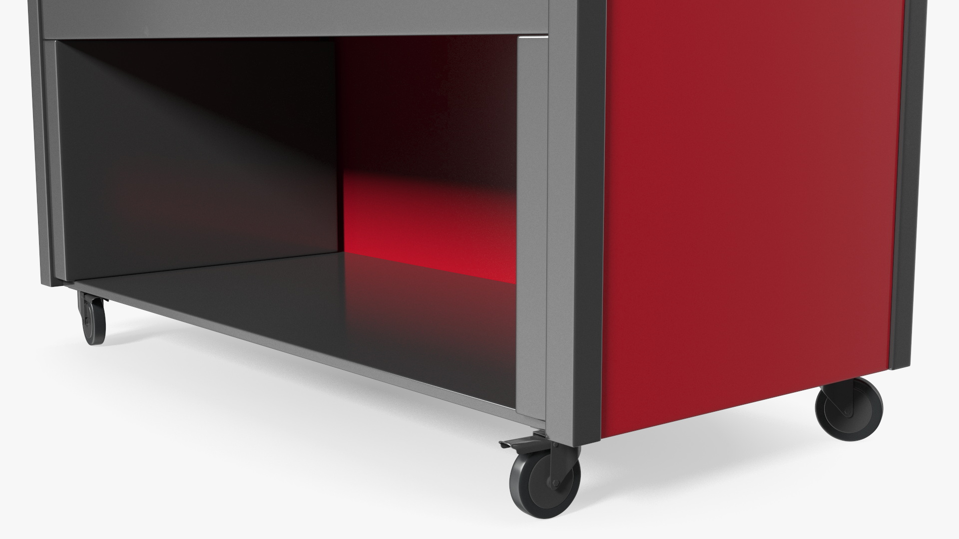 Detail (element or component) of the display counter line which is a narrow, long countertop row which is designed to keep pre-cooked food items easily accessible for self-service by customers. Element (detail or part) of self service line which is a series of special modular elements which are mounted on wheels (castors or rolls) which can easily be placed side-by-side, and which can be positioned individually as islands or joined in line.