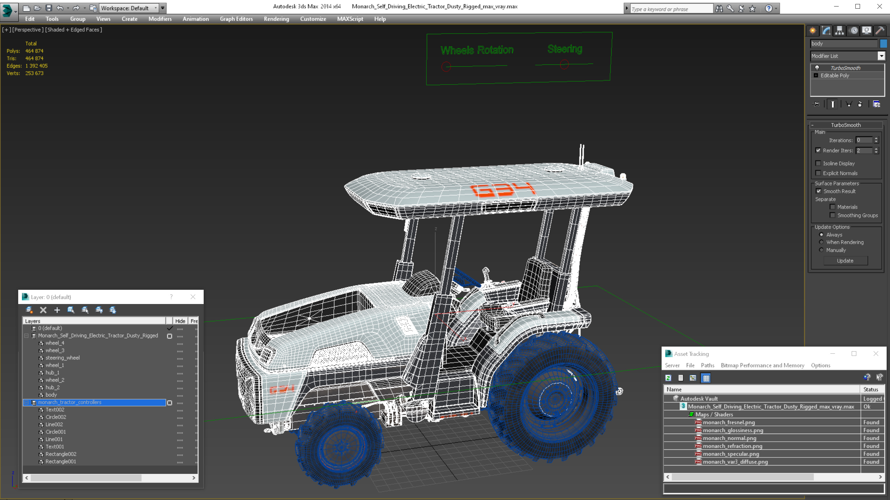Monarch Self Driving Electric Tractor Dusty Rigged is fully rigged and is ready to be animated. You can easily position it the way you need or animate it the way your project requires using helpers in 3D Studio Max. See the turntable to get an idea of how rigging works.