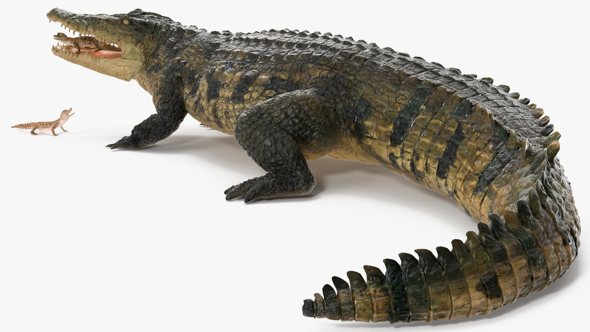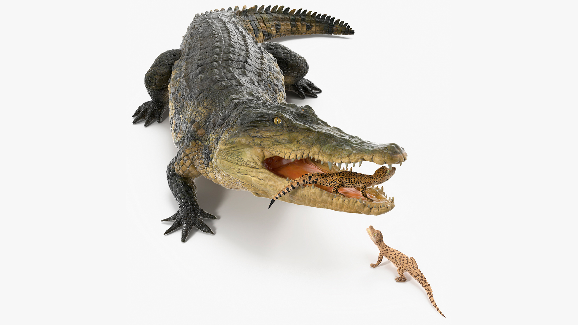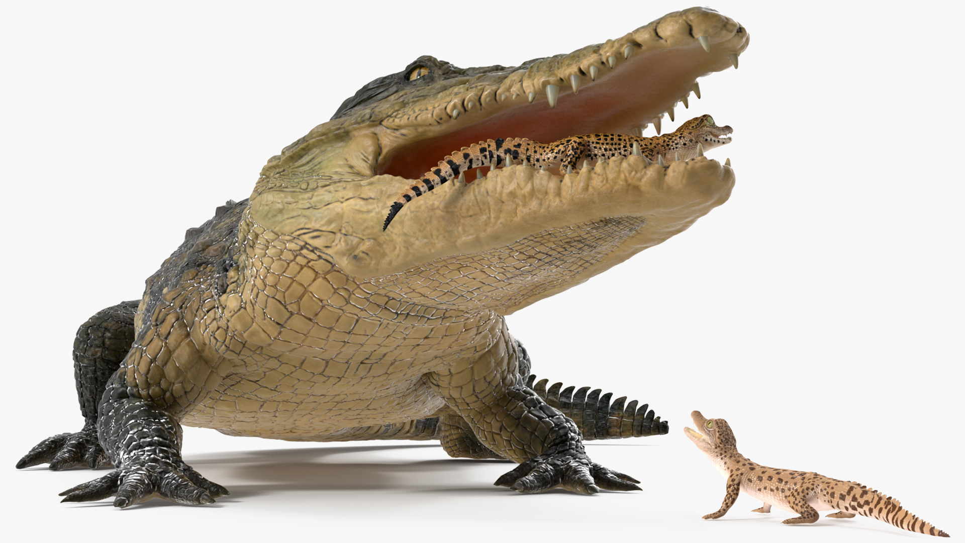 Mother Crocodile Carrying Baby is a three-dimensional model of young and adult examples of a large reptile creature, which is predatory, semiaquatic reptile animal.