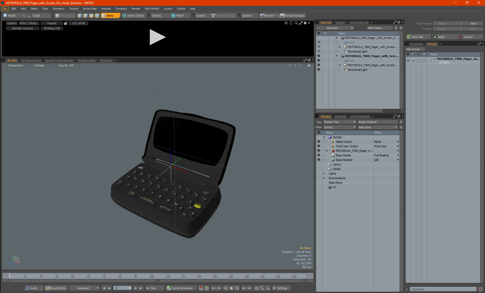 MOTOROLA T900 Pager with Screen On is a high quality, photo real 3d model that will enhance detail and realism to any of your rendering projects. The model has a fully textured, detailed design that allows for close-up renders, and was originally modeled in 3ds Max 2020 and rendered with V-Ray. Renders have no postprocessing!