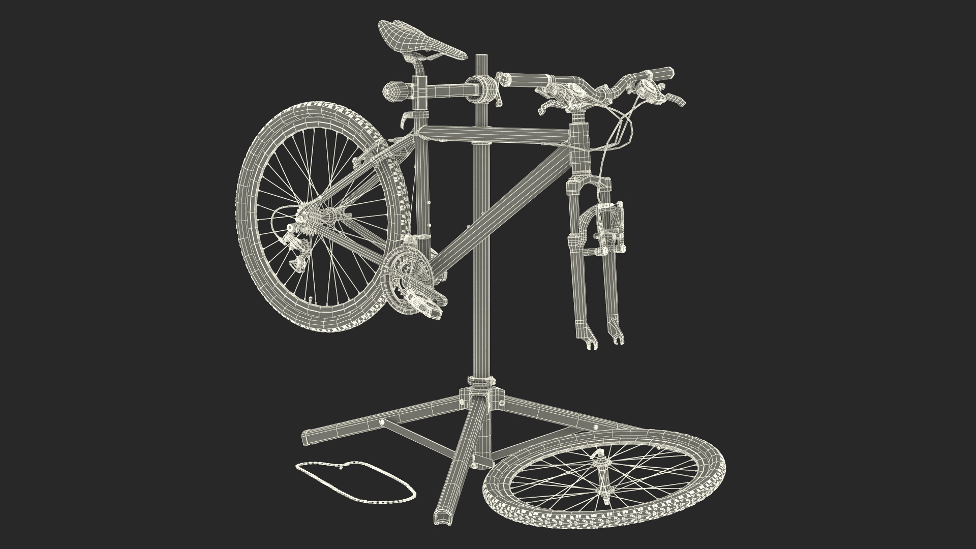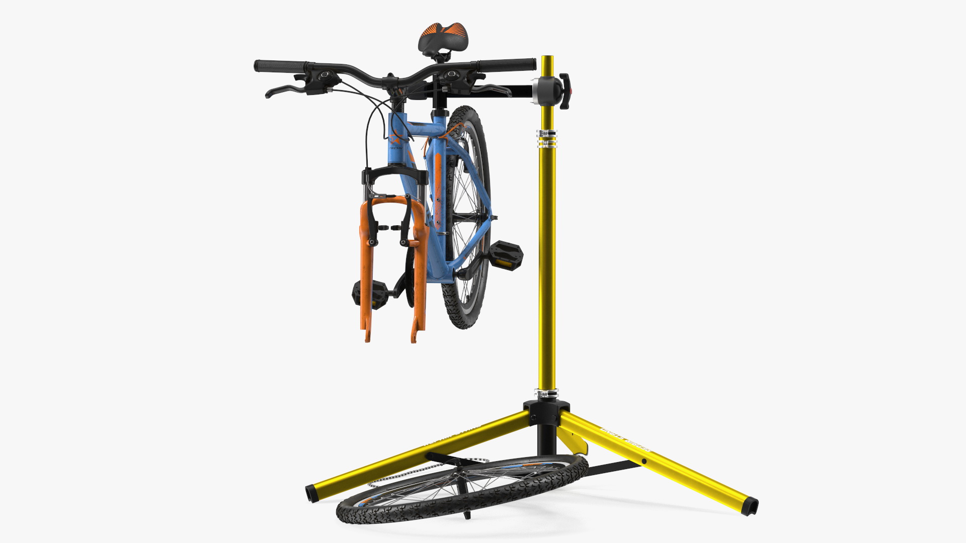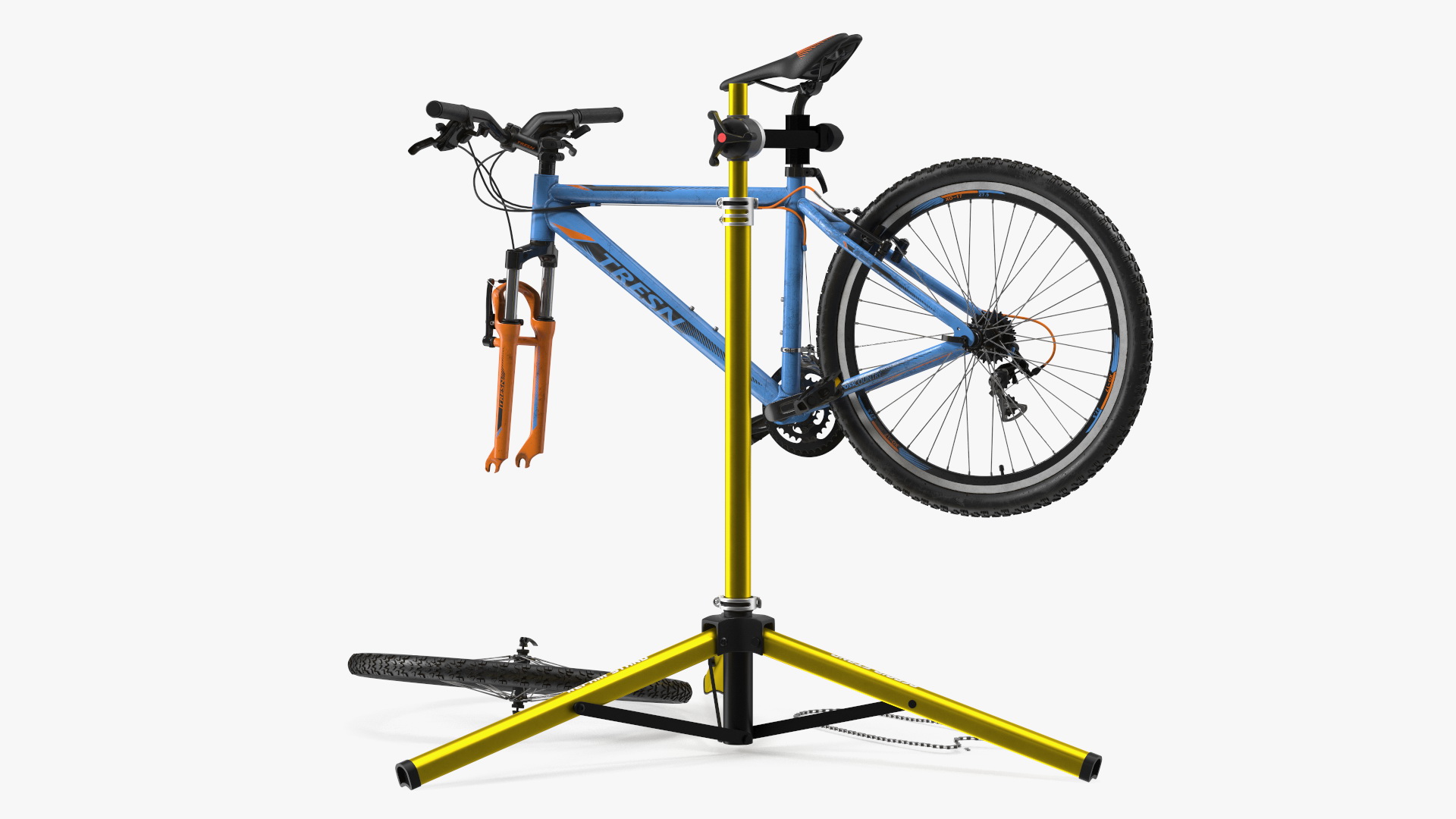 Mountain Bike Repair Stand with Parts is a three-dimensional model of specialized repair tool which is a bicycle (cycle type two wheel vehicle repair device) which is used for bicycle vehicle repair work, and which is used for washing, detailing and servicing at bike.