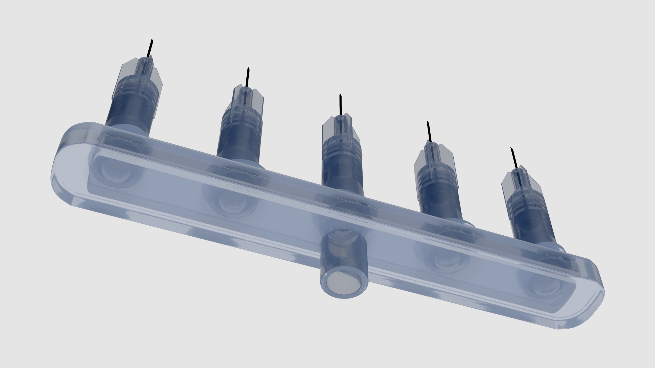 Multi Injector 5 Needles Straight Transparent is a three-dimensional model of a sophisticated medical injection device designed for simultaneous multi-point administration. This injector features a linear configuration with five precisely aligned needles, all set in a transparent body, facilitating clear visualization and precision in fluid distribution.