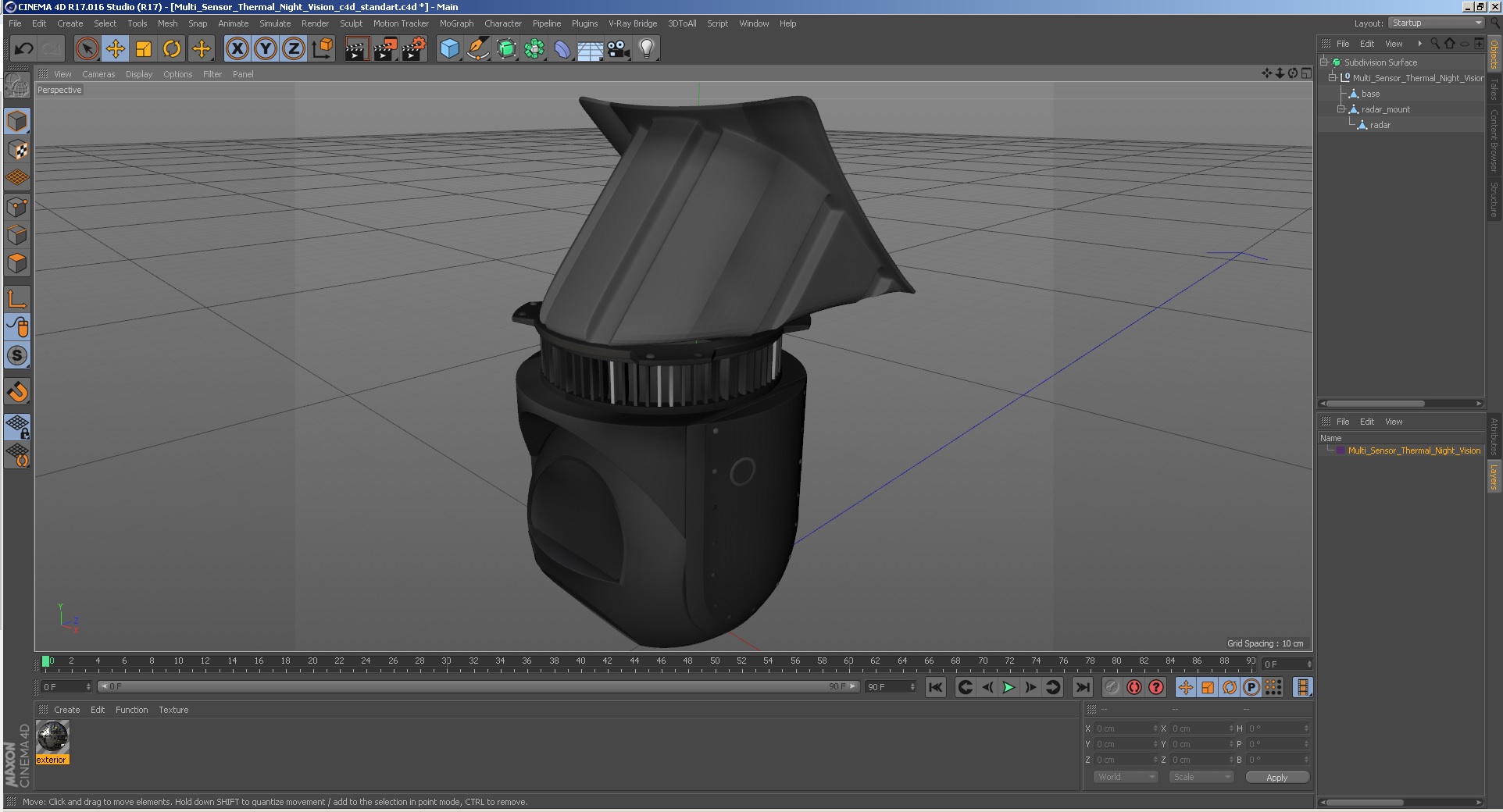 Multi Sensor Thermal Night Vision is a high quality, photo real 3d model that will enhance detail and realism to any of your rendering projects. The model has a fully textured, detailed design that allows for close-up renders, and was originally modeled in 3ds Max 2020 and rendered with V-Ray. Renders have no postprocessing!