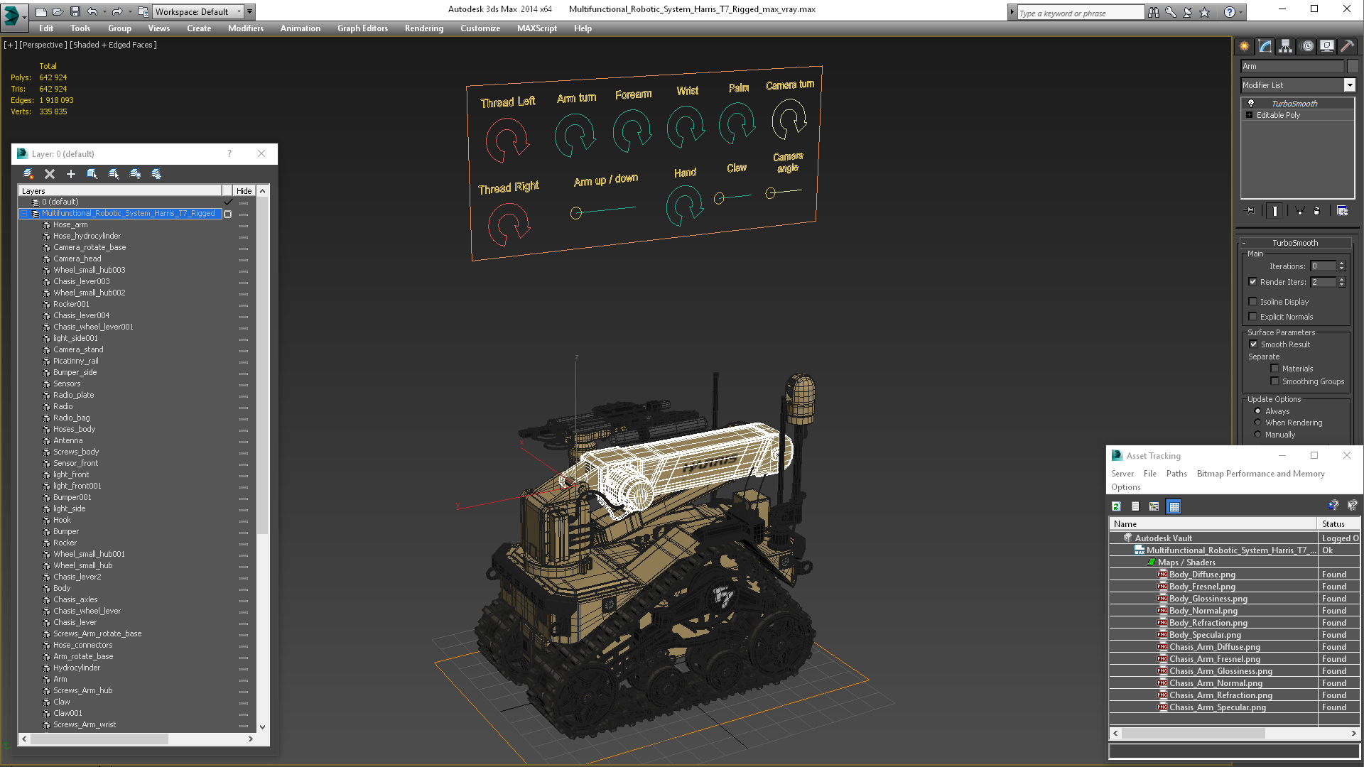 Multifunctional Robotic System Harris T7 Rigged is fully rigged and is ready to be animated. You can easily position it the way you need or animate it the way your project requires using helpers in 3D Studio Max. See the turntable to get an idea of how rigging works.