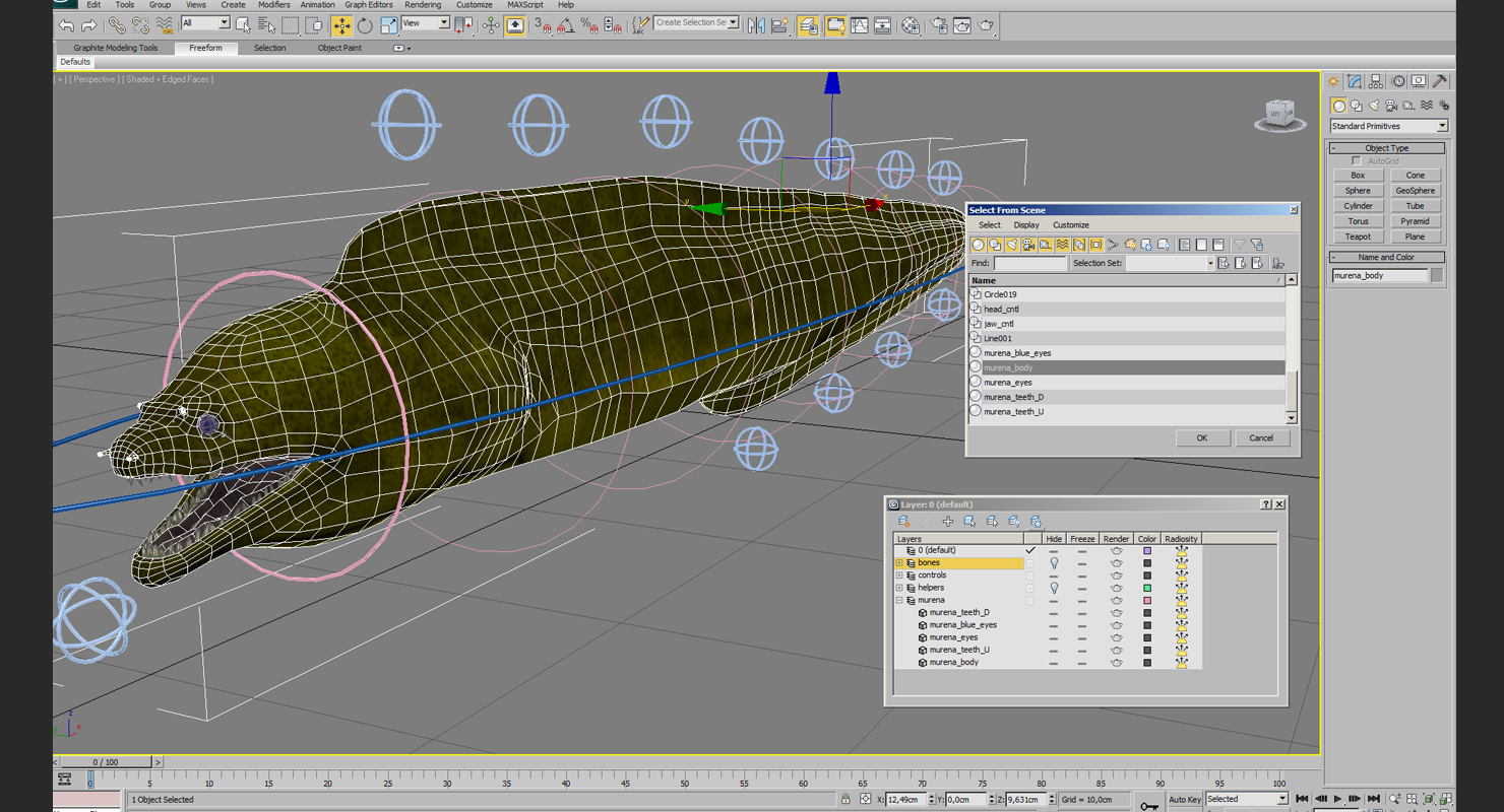 Murena Rigged is fully rigged and is ready to be animated. You can easily position it the way you need or animate it the way your project requires using helpers in 3D Studio Max. See the turntable to get an idea of how rigging works.