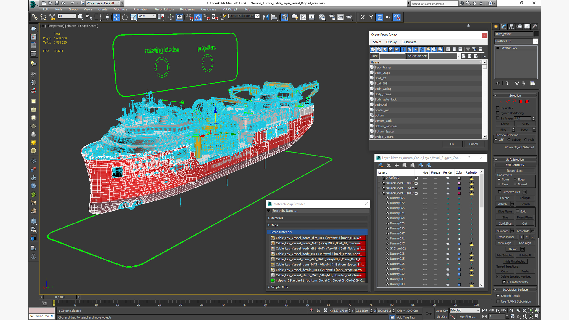 Nexans Aurora Cable Layer Vessel Rigged is fully rigged and is ready to be animated. You can easily position it the way you need or animate it the way your project requires using helpers in 3D Studio Max. See the turntable to get an idea of how rigging works.