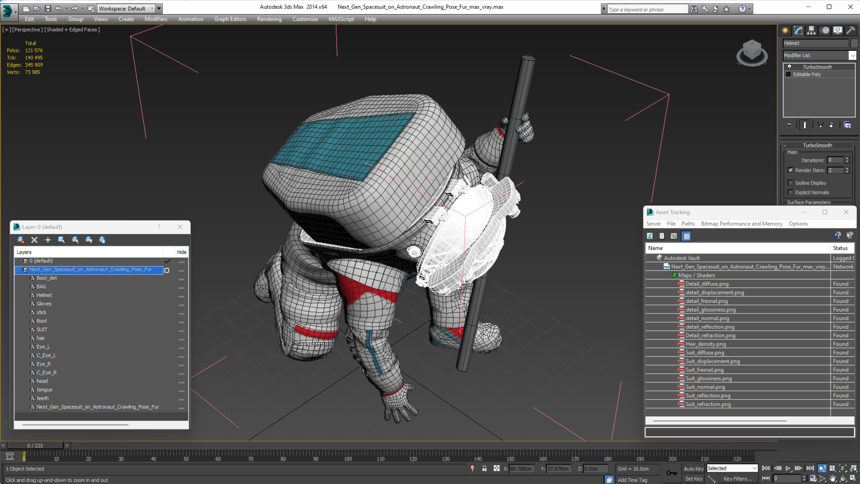 Next Gen Spacesuit on Astronaut Crawling Pose Fur has a 3dsmax Fur modifier, hair customizable (hair count, hair segments, hair color, root size, tip size, etc).