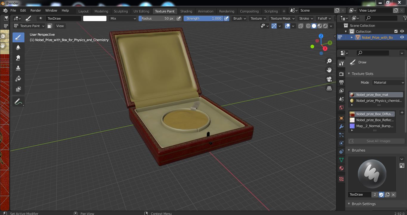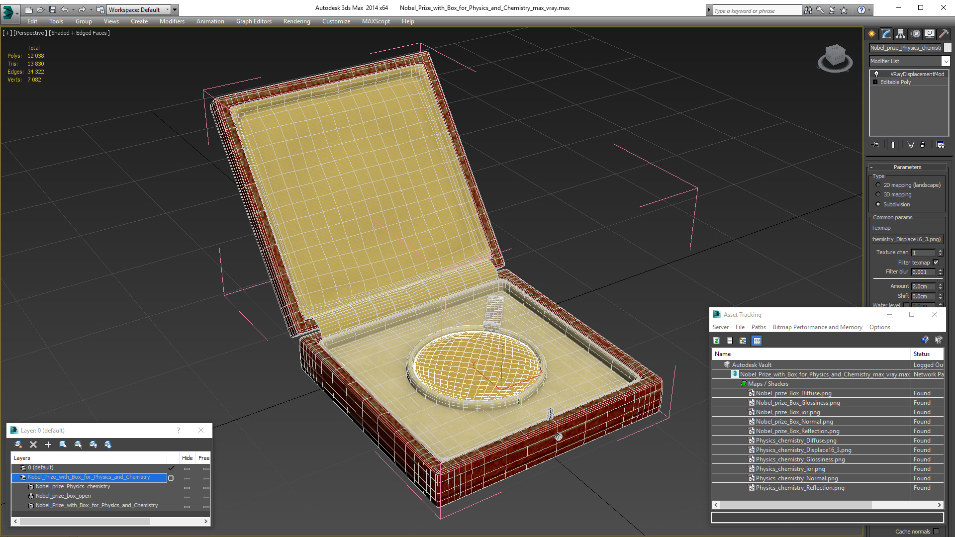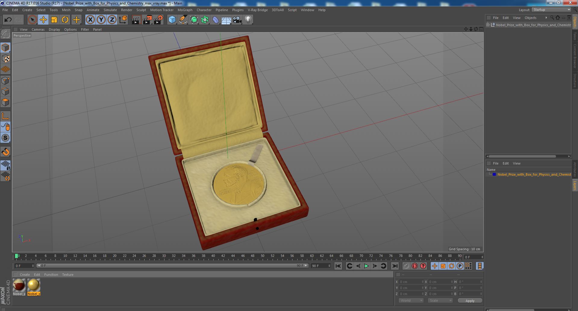 Nobel Prize with Box for Physics and Chemistry is a high quality, photo real 3d model that will enhance detail and realism to any of your rendering projects. The model has a fully textured, detailed design that allows for close-up renders, and was originally modeled in 3ds Max 2020 and rendered with V-Ray. Renders have no postprocessing!