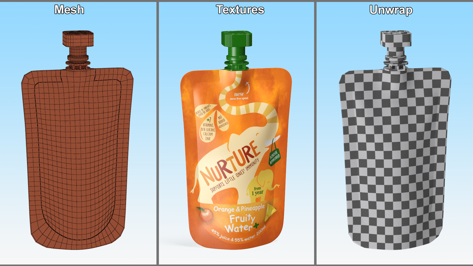 Nurture Fruity Water Orange and Pineapple is a 3d model of a refreshing beverage package, designed to showcase the vibrant and appealing blend of orange and pineapple flavors in a health-oriented drink.