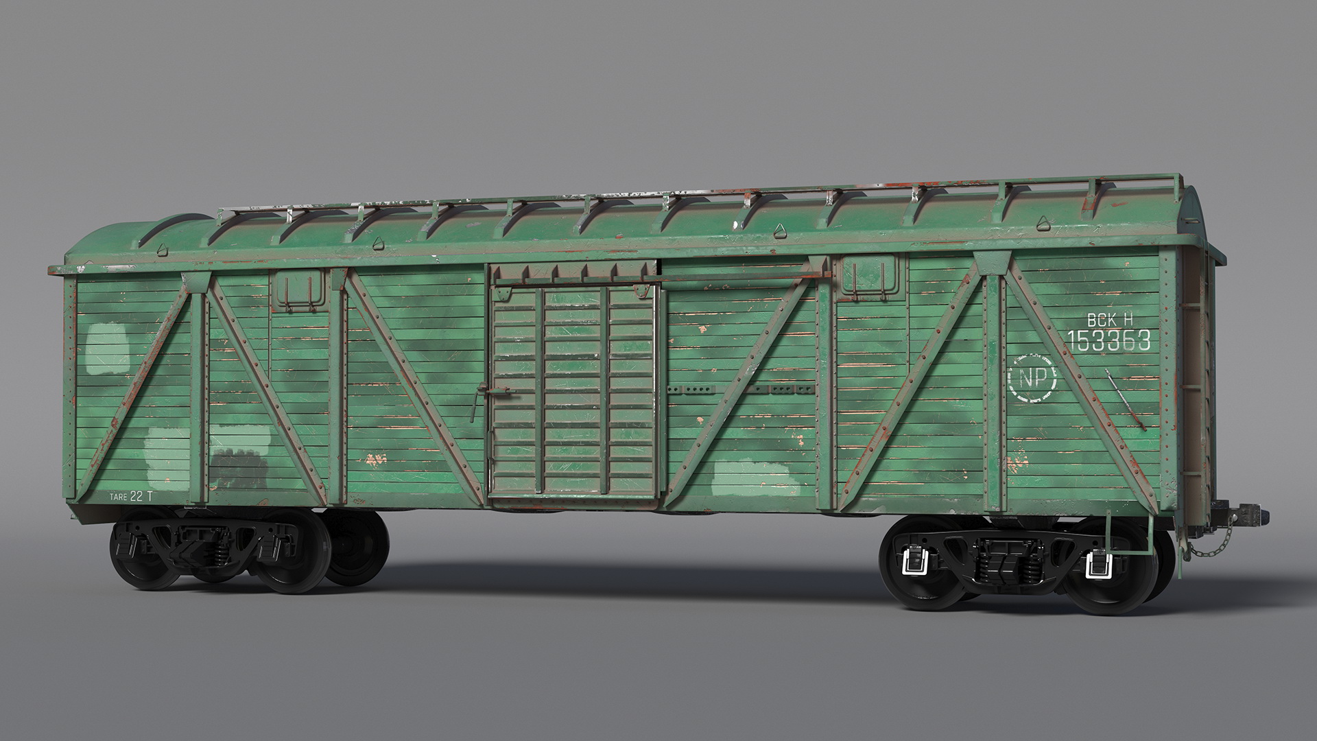 Old Cargo Wagon Green is a three-dimensional model of railroad cargo wagon, carriage, or freight car, that is a vehicle used on railway tracks to transport goods and materials.