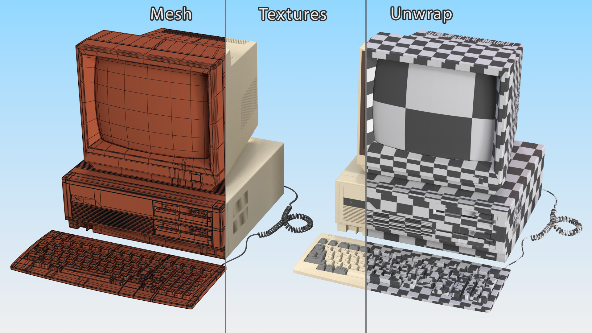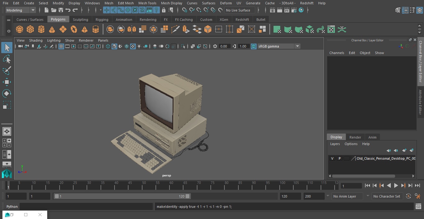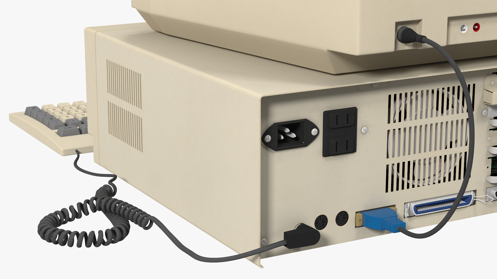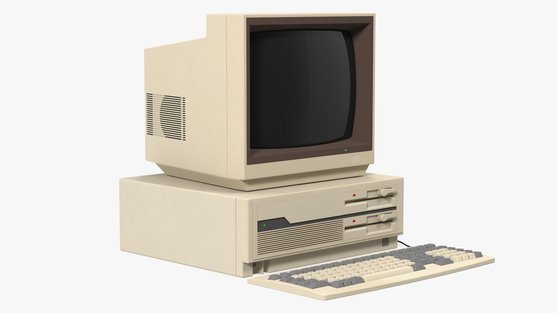 Old Classic Personal Desktop PC is a 3D model of the ancient computer system unit with display device (monitor) and keyboard.