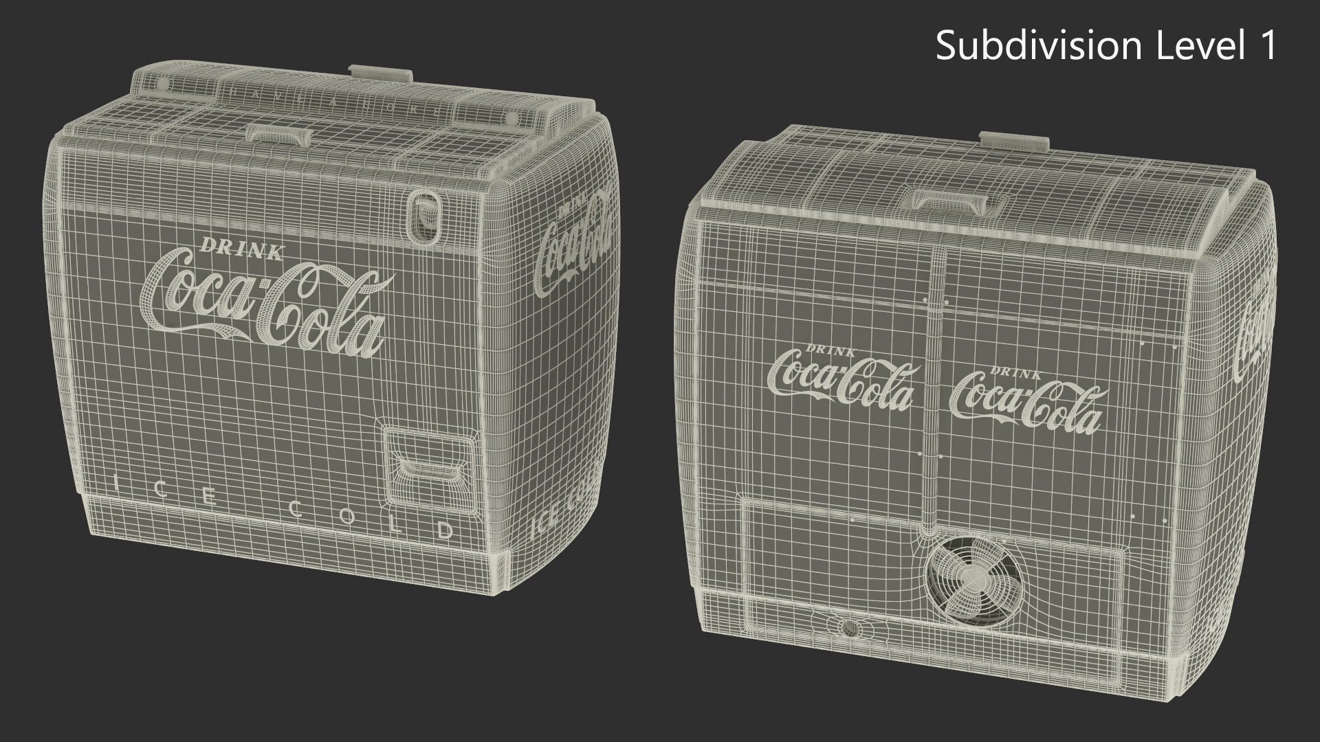 Old Refrigerator with Coca Cola Inside is a three-dimensional model of retro style (vintage) compact portable cooler (refrigerator type chest) that is designed to store and chill beverages, particularly Coca-Cola products.