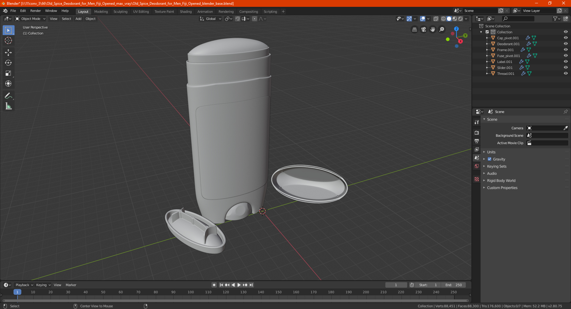 Old Spice Deodorant for Men Fiji Opened is a high quality, photo real 3d model that will enhance detail and realism to any of your rendering projects. The model has a fully textured, detailed design that allows for close-up renders, and was originally modeled in 3ds Max 2020 and rendered with V-Ray. Renders have no postprocessing!
