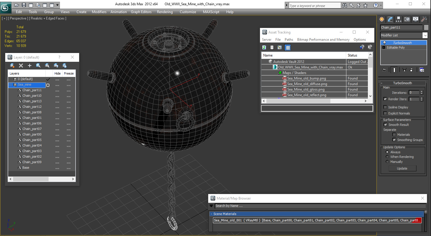 Old WWII Sea Mine with Chain is a high quality, photo real 3d model that will enhance detail and realism to any of your rendering projects. The model has a fully textured, detailed design that allows for close-up renders, and was originally modeled in 3ds Max 2020 and rendered with V-Ray. Renders have no postprocessing!