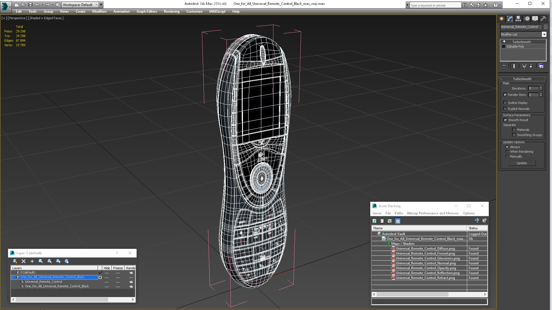 One for All Universal Remote Control Black is a high quality, photo real 3d model that will enhance detail and realism to any of your rendering projects. The model has a fully textured, detailed design that allows for close-up renders, and was originally modeled in 3ds Max 2020 and rendered with V-Ray. Renders have no postprocessing!