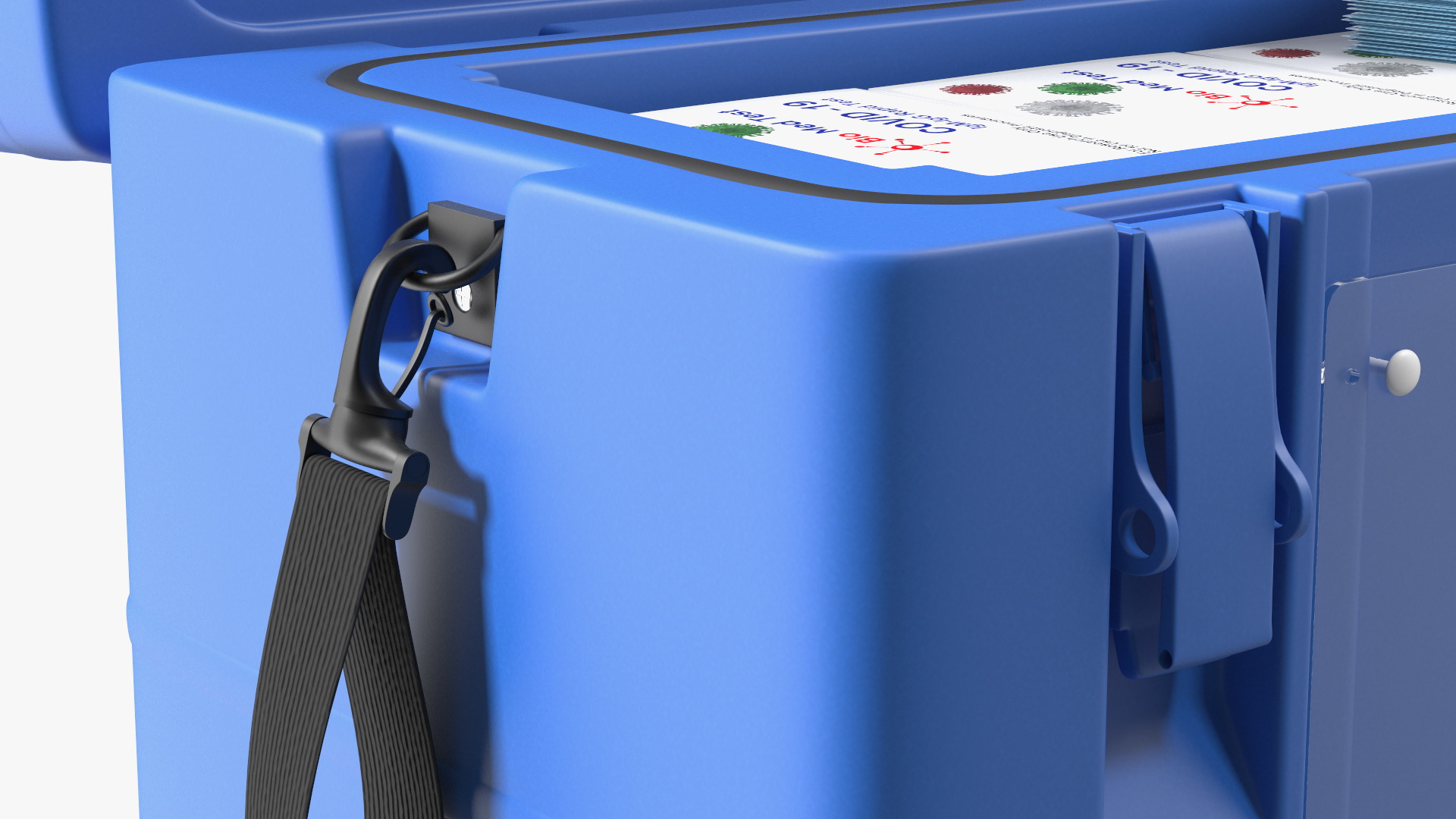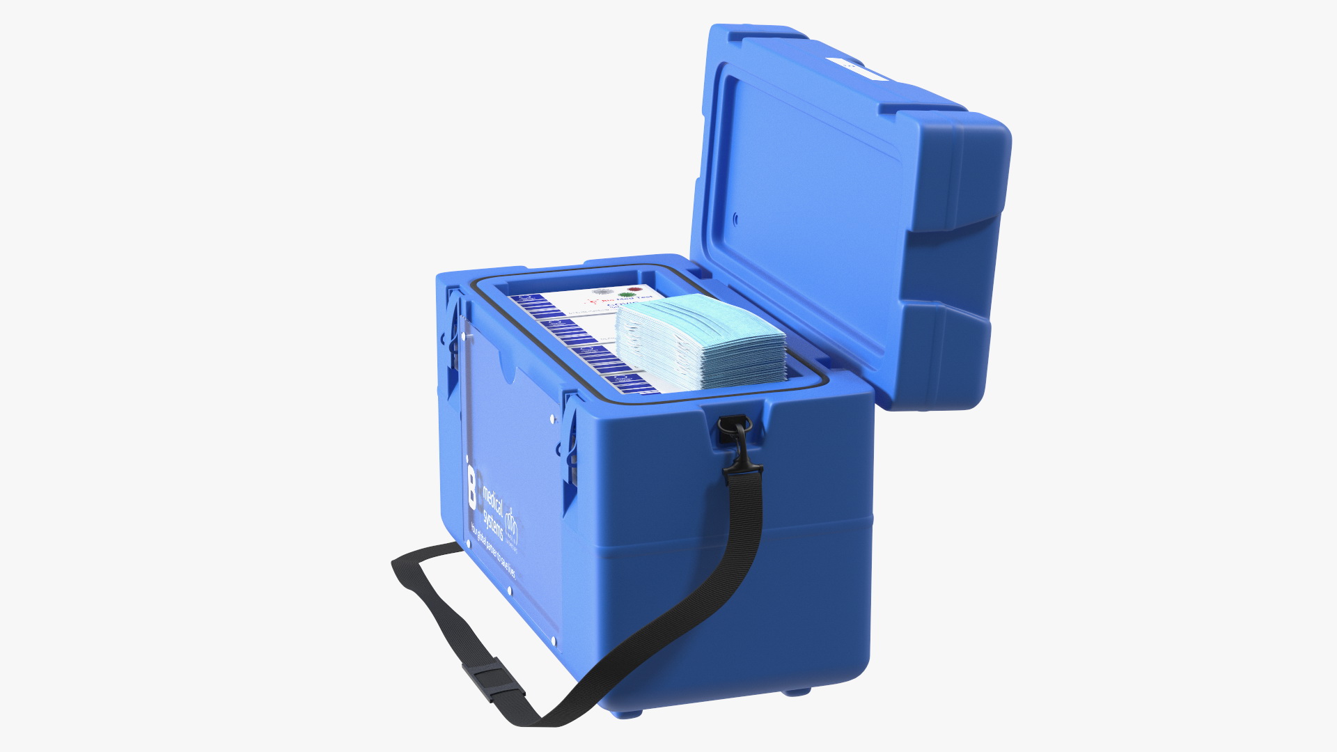 Open Transport Box With Covid Tests and Masks is a three-dimensional model of a medical cold box carrier.